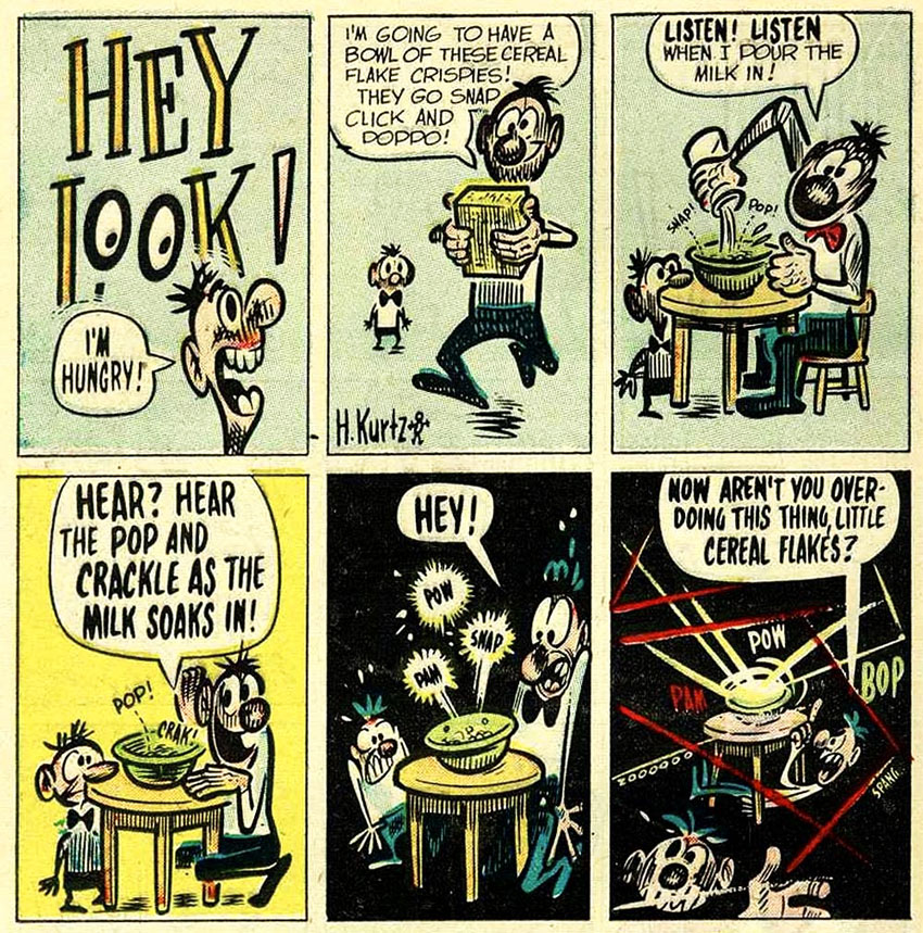 It cannot be denied that Kurtzman was Mad's spiritual father. He came up with their title, familiar logo, sarcastic attitude, self-deprecating comedy (like their long-running slogan: "25 cents, Cheap!") and invented their very style of parody. Each spoof opens with a huge splash panel covering half of the page, with the title displayed in large letters ending on an exclamation mark! The title and characters of a particular comic, film or TV show are changed into an incredibly lame pun - 'Popeye' becomes 'Poopeye', 'G.I. Joe' is bastardized to 'G.I. Shmoe', 'Prince Vaillant' transforms into 'Prince Violent'. Everything is drawn in a wacky style. The illustrator stacks every panel with funny background events, signs and random cameos of celebrities or pop culture characters. As the tale unfolds, all the formulaic writing of the original is hilariously exposed, eventually culminating to a twist ending. Kurtzman invented many running gags, such as the name 'Melvin' and puzzling expressions like "furshlugginer", "potrzebie", "schmuck", "veeblefetzer", "ecch" and "blecch", which were in fact derived from Yiddish or Russian-Ukrainian-Lithuanian words. He also pioneered one of Mad's longest-running features, 'Scenes We'd Like to See', which first appeared in issue #23 (May 1955), and provided hilarious twists to stale plot devices. Between issue #24 (July 1955) and #30 (December 1956) Kurtzman drew tiny little doodles in the margins of every cover, an idea that Sergio Aragonés revived in 1963 in his own 'Mad Marginals'.