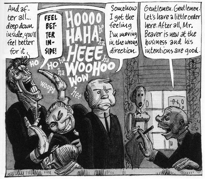 Kurtzman's best known feature in Help! was Goodman Beaver, the naïve everyman he reused from his prior graphic novel 'Jungle Book'. From the 10th issue of Help! (May 1961) on, Beaver was featured in many satirical comics, illustrated by Will Elder. The young idealist typically finds himself in an odd location, asking questions about the madness surrounding him. In one episode he goes to Africa, where he confronts Tarzan with his supposed white colonial attitudes towards the natives. In 'Goodman, Underwater' (May 1962), Goodman meets a Don Quixotesque underwater crimefighter who fights invisible enemies. The entire story is done in the style of Gustave Doré's illustrations of Cervantes' famous novel. Other episodes brought Goodman in contact with Marlon Brando and a disillusioned Superman. In 'Goodman Goes Playboy' (issue #13, February 1962), the teenager meets Archie from Archie Comics who has now succumbed to the Playboy style. Archie and his friends turn out to have signed a pact with "the Devil", AKA Hugh Hefner. As many follow their example, Goodman wonders whether he "should leave to find a place where the dark forces aren't closing in... where honor is still sacred and where virtue triumphs?" But he quickly changes his mind: "Maybe I should sign up."