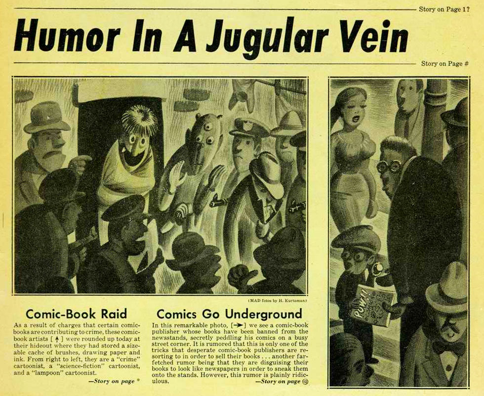 Kurtzman commented on the witch hunt against comic books on the cover of Mad #16 (October 1954). Note the headline 'Comics Go Underground', which was the first time the term 'underground comix' was used, a full decade before it was coined to the genre.