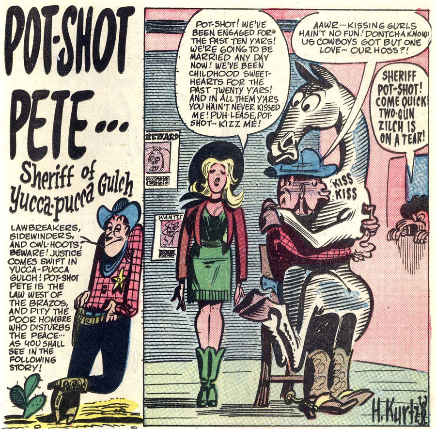 Stan Lee gave Kurtzman more assignments, including the funny animal comic 'Pigtales' (1946-1947) and the humorous family comic 'Rusty' (1949), which Lee scripted for him. Between March and June 1948, Kurtzman's Sunday comic 'Silver Linings' (1948) appeared in the New York Herald Tribune, which was basically a compact version of 'Hey Look!'. Kurtzman also published gag comics like 'Egghead Doodle', 'Genius' (later revived as 'Sheldon' in Kurtzman Komix) and 'Pot-Shot Pete' for comic books by Timely Comics, National Periodicals, Toby Press and Parents' Magazine Press. Of all these, 'Pot-Shot Pete' was the most memorable. A funny western parody ridiculing various platitudes, it appeared in American Western (February/March 1950) and was later reprinted in issue #4 (1950) of Jimmy Wakeley and John Wayne Adventures #5 (1950) and issues #15 (September 1954) and #18 (December 1954) of Mad Magazine. In addition, Kurtzman made some children's books for Kunen, some in collaboration with René Goscinny: 'Round the World', 'Hello Jimmy', 'The Little Red Car' and 'The Jolly Jungle'. He also wrote two episodes of Dan Barry's 'Flash Gordon' (1952-1953), co-illustrated by Frank Frazetta, and contributed wonderfully wacky and crowded cartoons to magazines like Varsity and College Life.