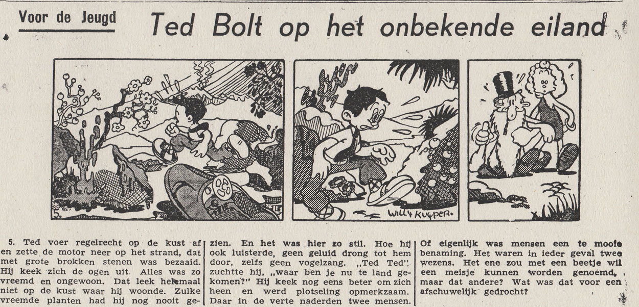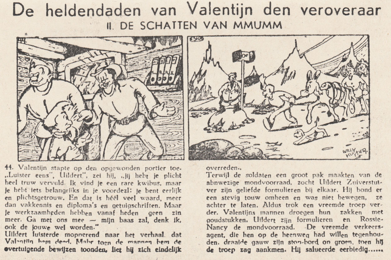 Another comic by Willy Kuyper, 'Ted Bolt op het onbekende eiland' ("Ted Bolt on the Unknown Island", 1947), ran in De Vrije Alkmaarder, Amersfoortsche Courant, Het Vrije Volk and Leidsche Courant. It presented the adventures on a faraway island of a hero with strong visual resemblances to Piet van Elk's creation 'Bim'. 'Valentijn de Veroveraar' also consisted of two serials, namely 'Het Levenswater' (November 1946 - December 1947) and 'De Schatten van Mmumm' (December 1947-February 1948). Literally translated as "Valentine the Conqueror", the protagonist was the bravest warrior of the faraway country of Melkanje. His adventures appeared in papers such as Het Vrije Volk, Bredasche Courant, Goudsche Courant and Helmondsche Courant.