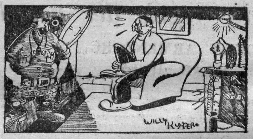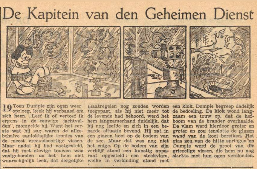 The last known comic creation by Willy Kuyper was 'De Kapitein van den Geheimen Dienst' (Nieuwsblad van het Zuiden, 1947), AKA 'Kaptein Dumpeladoris' (Nieuwe Schiedamsche Courant, 1947), which followed the adventures of J.G. Dumpeladoris, a Captain of the Secret Service. Nicknamed Dumpie, he is sent out to investigate a mystery surrounding the steamboat Louise, but ends up entangled in a gang of cocaine smugglers and goldmakers. Note that Kuyper's later comics no longer mentioned Stripfilm in the copyright byline, and that the second 'Valentijn' serial (his last published comic) instead carried the "Eska Studio's" imprint.