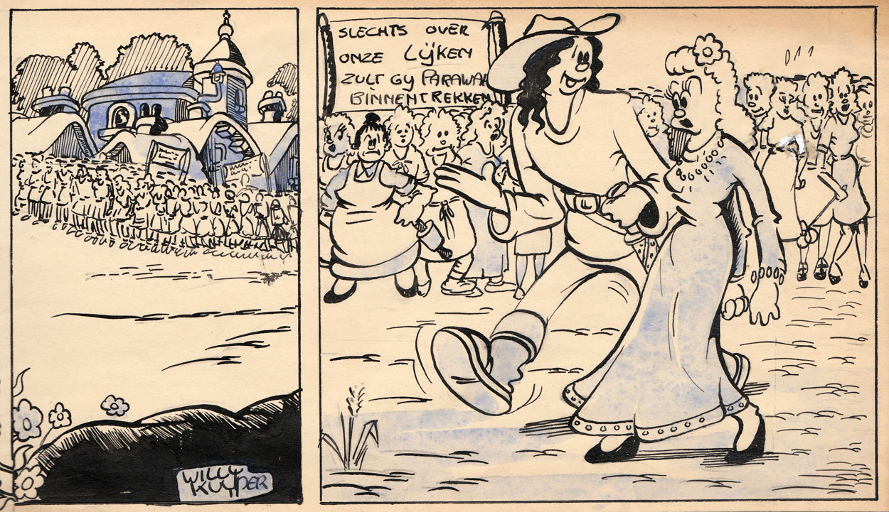 Launched out of the ashes of an ill-fated attempt at a full-blown animation studio, Piet van Elk's Stripfilm Studio dedicated itself to the production of newspaper comics for the many regional newspapers that were (re)launched in the recently liberated Netherlands. Besides his regular companions Albert van Beek and Siem Praamsma, Van Elk attracted new artists like Hans Nije, Henk Albers, Francis Paid and Willy Kuyper to fulfill this mission. The Amsterdam-based group produced several strips which were distributed by the Persbelangen agency to not only Dutch newspapers, but also Belgian ones, such as Het Volk and Vooruit. Willy Kuyper joined the crew in early 1946, and applied the same jolly, round drawing style as most of his colleagues.