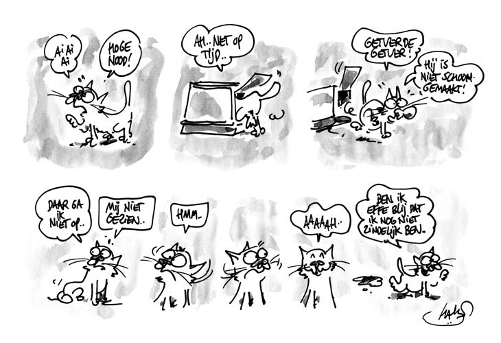 'Joop en Harrie'. Translation: "Oh, oh. Nature calls. Ah, just in time. God damn! God damn! It hasn't been cleaned yet. I'm not sitting on that, not me. Hmm... Aaaaah... Am I glad that I'm not yet potty-trained."