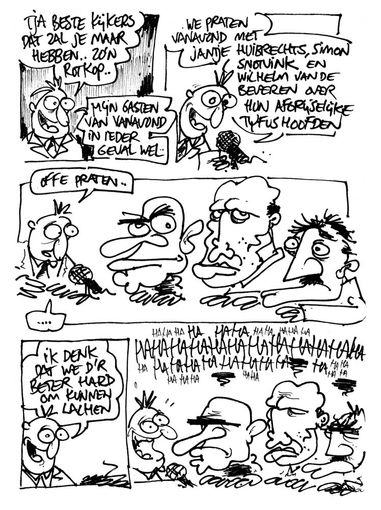 Comic published in Walhallie (2009). Translation: "Well, dear viewers. It should happen to you... such an ugly head... My guests for tonight each have one. Tonight we talk with Jantje Huibrechts, Simon Snotvink and Wilhelm van de Beveren about their horrible tyfus heads. Let's talk... On second thought, I think it's better to laugh about it! HAHAHAHAHAHAHAHAHAHAHA!