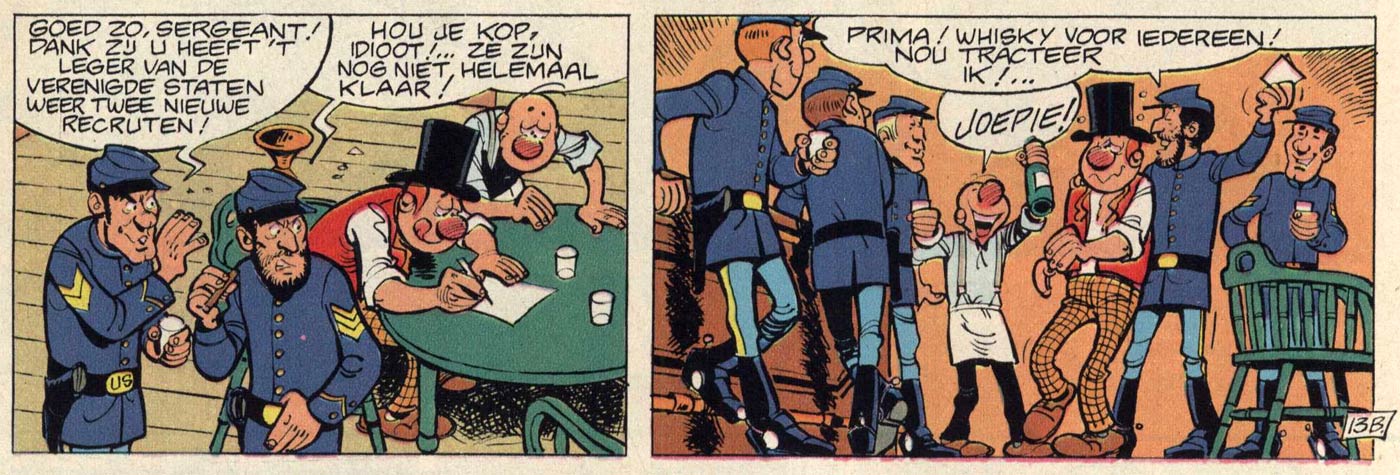 Lambil's rise to the top of the comic industry was preceded by a tragedy. On 23 May 1972, his friend and colleague Louis Salvérius died suddenly from a heart attack. He was only 42. Four years earlier, Salvé and scriptwriter Raoul Cauvin had created their successful comic series 'Les Tuniques Bleues' ("The Bluecoats", 1968- ), about two cavalry soldiers during the U.S. Civil War. The series had been launched to fill the void after René Goscinny and Morris took their famous cowboy comic 'Lucky Luke' from Spirou to Pilote magazine, and quickly managed to become one of Spirou's most popular features in its own right. In Robbedoes, the Dutch-language edition of Spirou, the series appeared under the title 'De Blauwbloezen'.