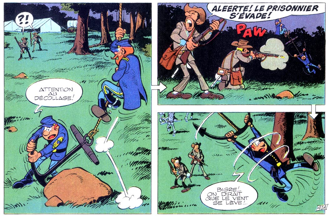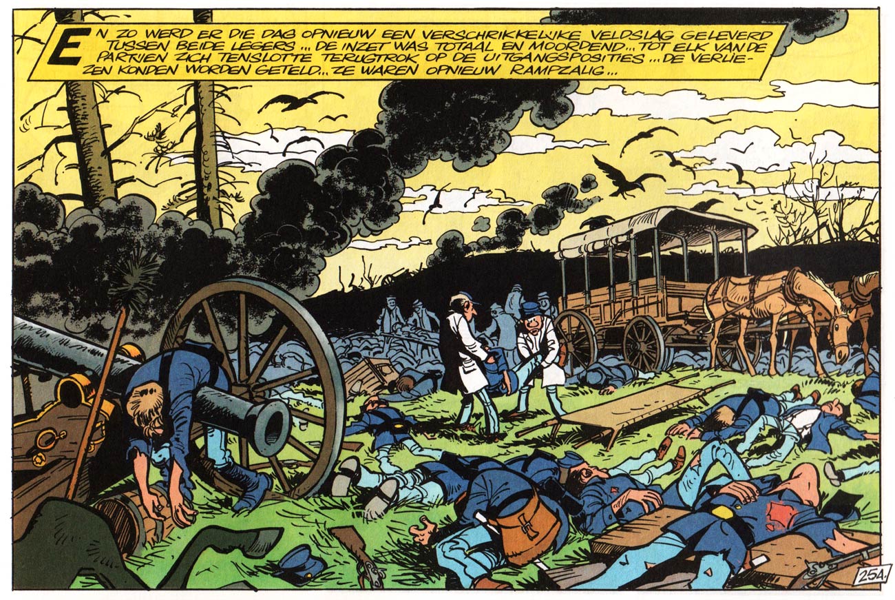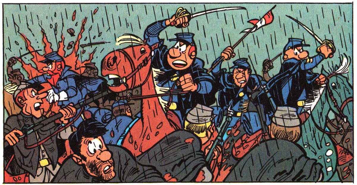 The comedy contrasts between Blutch and Chesterfield form the basis of each story, but at the same time, 'Les Tuniques Bleues' shows very graphic depictions of battlefield gruesomeness, complete with wounded, crippled and dying soldiers. In the early 1970s, this marked a heavy shift from the bloodless adventures of 'Lucky Luke', which were created in more censor-heavy times. As 'Les Tuniques Bleues' became a hit, starting in 1970, Dupuis also released the stories in book format.