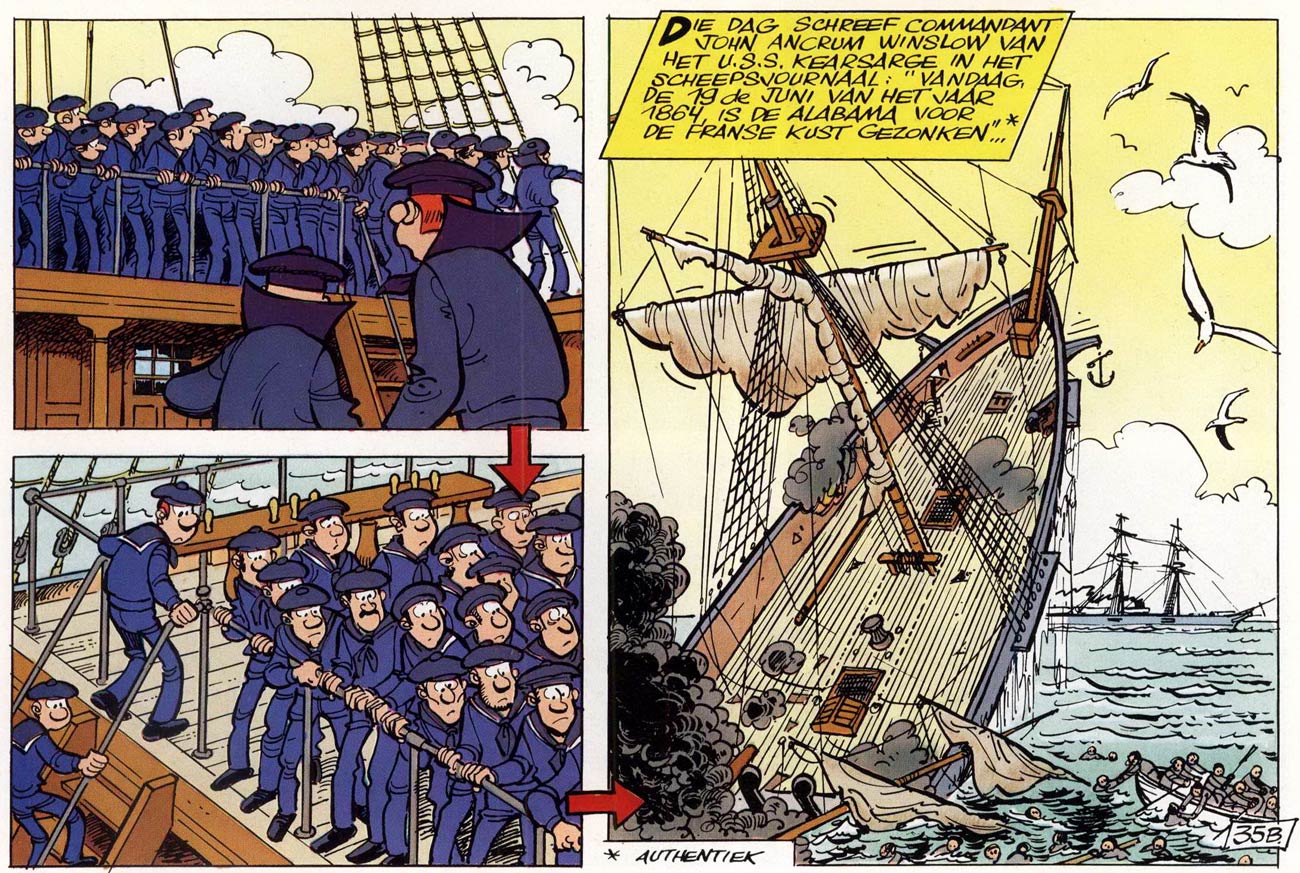 As documentation, Lambil mainly used historical reference guides about the Secession War. Several stories were inspired by real-life events, like the Battle of Bull Run, the Andersonville Prison, the Union Army Balloon Corps, the naval battles of Hampton Roads and Cherbourg, the warships USS Monitor and the USS Kearsarge. Just like in 'Lucky Luke', historical characters also have guest roles, including President Abraham Lincoln, generals Ulysses S. Grant and Robert Lee, surgeon Mary Edwards Walker, Confederate guerrilla leader William Clarke Quantrill and the militia group the Nancy Harts.