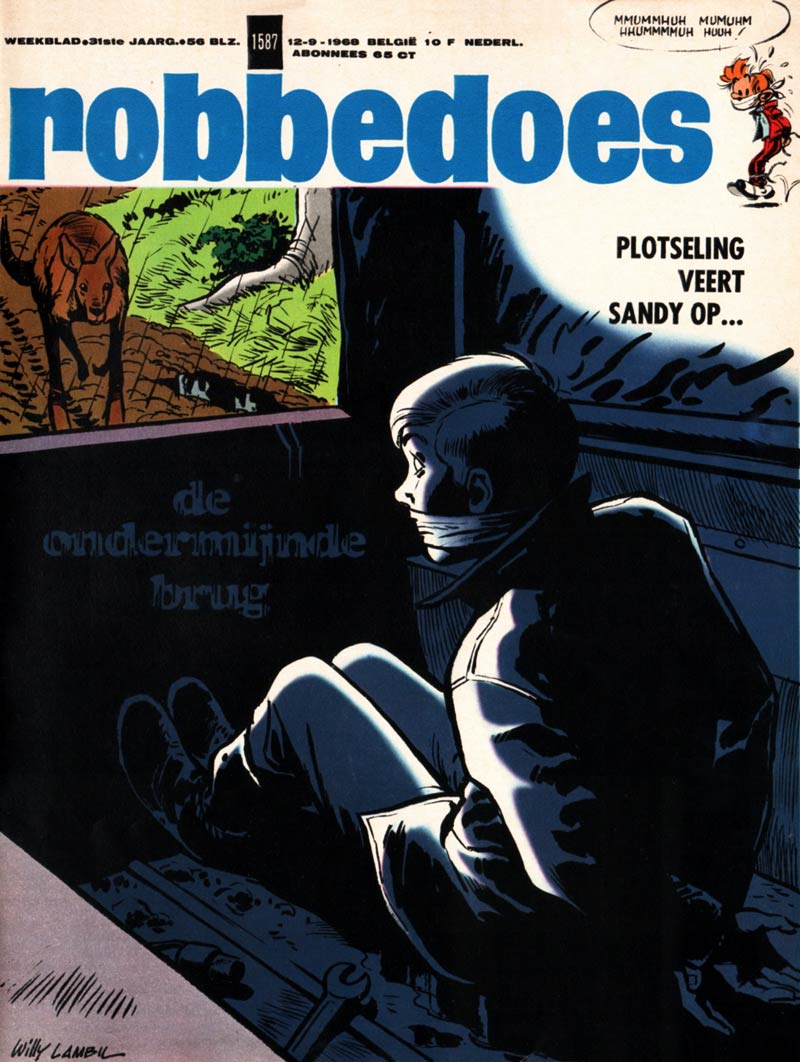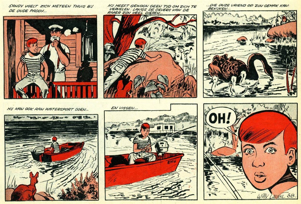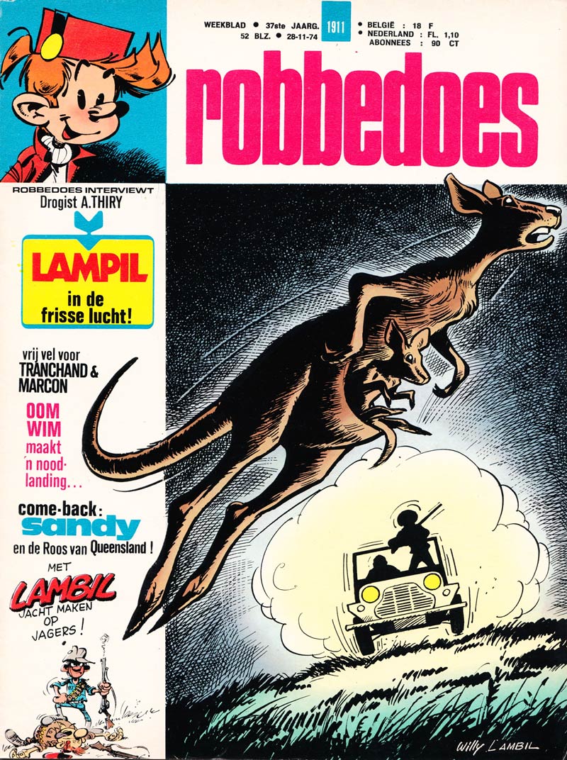 In March 1959, Lambil launched his first comic series in Spirou, 'Sandy et Hoppy' (1959-1974), a concept he had been working on since the age of 15. The stories explore the Australian outback, where the young boy Sandy Reynolds and his pet kangaroo Hoppy live. The documentary maker Michael Forster often accompanies them on their adventures. The first 'Sandy et Hoppy' story was written in collaboration with Henri Gillain, but from the second story on, Lambil assumed full writing duties. In contrast with his later work, Lambil used a realistic graphic style. In the second half of the 1960s, 'Sandy et Hoppy' stories were also reprinted in Samedi Jeunesse, a monthly comic magazine published by Éditions du Samedi.
