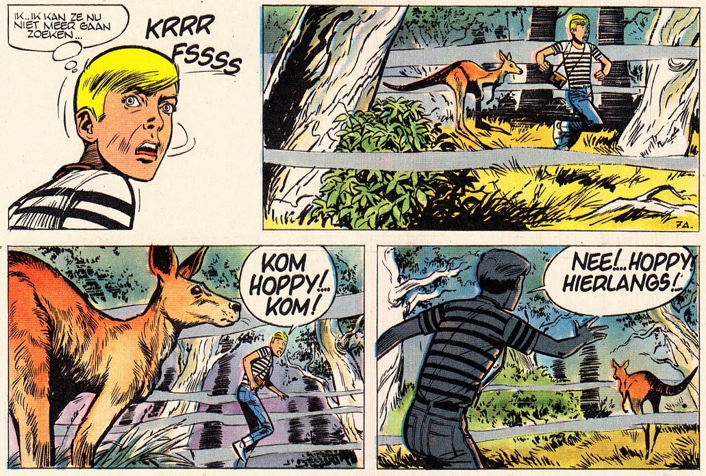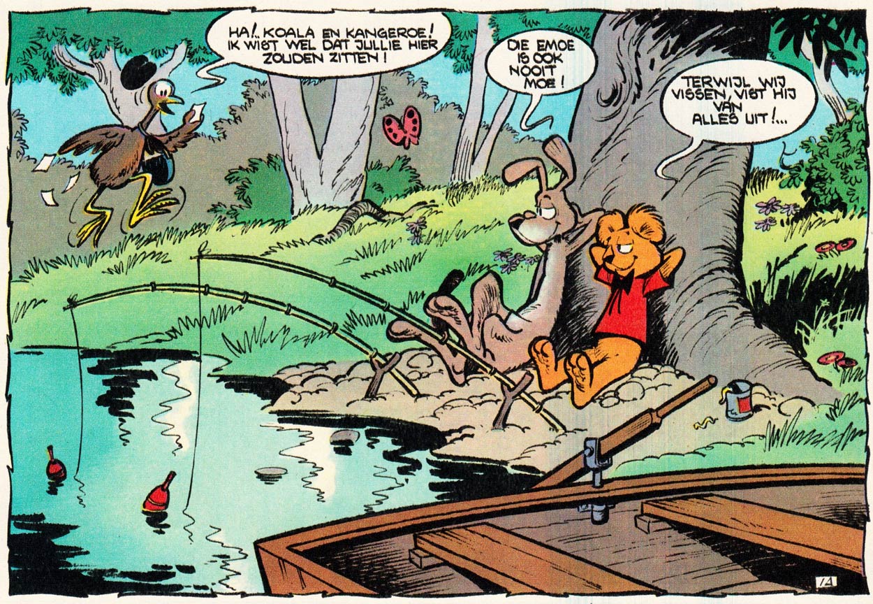 During the early years of his career, Lambil established himself as a realistic comic artist. For Spirou's fold-in mini-books section, he temporarily switched to humor when making the funny animal story 'Kangourou, Koala et Kiwi Contre Kookaburra' (1960). Written by editor-in-chief Yvan Delporte, it was intended as a spoof of Lambil's lead series, imagining the fanciful adventures of a group of Australian forest animals, including a koala and a kangaroo. Between 1968 and 1973, this one-shot funny animal comic was expanded with a follow-up series of irregularly appearing short stories. Now titled 'Hobby et Koala', Serge Gennaux became its new scriptwriter.