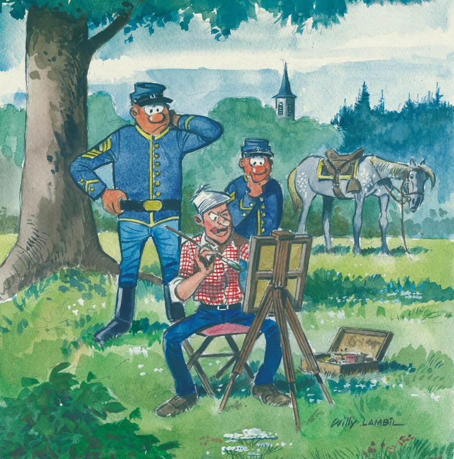 Willy Lambil has been one of the mainstays of the publishing house Dupuis and its comic magazine Spirou for many decades. Beginning his career at the publisher's art studio, his first notable work as a comic artist was 'Sandy et Hoppy' (1959-1974), an adventure comic set in the Australian outback. However, Lambil is best-known as the second artist of 'Les Tuniques Bleues' (1968-   ), a humorous adventure comic set during the American Civil War, written by Raoul Cauvin. Taking over in 1972 from the late Louis Salvérius, Lambil changed the series' visual style and gave the cast members their definitive designs. Together with Cauvin, he also added new recurring characters, such as corporal Blutch's horse Arabesque, the cynical Captain-Major Stephen Stilman and antagonist Cancrelat. In the following decades, Lambil and Cauvin turned 'Les Tuniques Bleues' into one of Belgium's hit comic book series, with over 23 million copies sold. As a side project, Lambil and Cauvin have also made the semi-autobiographical gag series 'Pauvre Lampil' (1973-1994), a spoof of Lambil's personal stress, his bumpy working relationship with Cauvin and the comic industry in general.