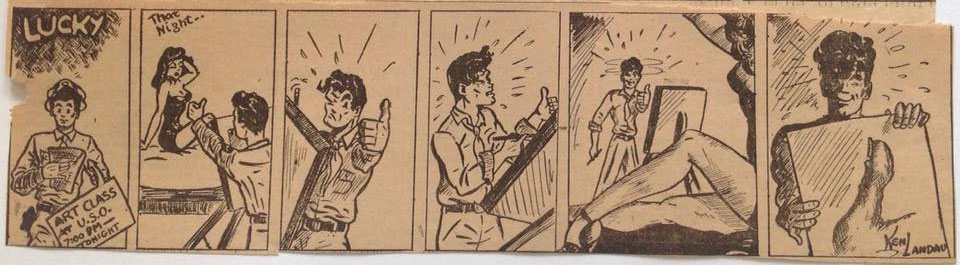 On 7 December 1941, the United States entered World War II. In 1944, Ken Landau was drafted and trained at Camp Howze, Texas. According to the website maintained by his daughter, Landau was well liked among his fellow recruits. They regarded him as a famous artist, because he had worked for Disney. Some of his drawings were on display in the soldiers' gym hall. During his military service, he drew a semi-autobiographical gag comic titled 'Lucky' (1945-1946), of which Landau modeled the title hero after himself. After initial publication in the Sheppard Field Army newspaper, the feature also ran for a month in the Herald Examiner in Los Angeles, California.