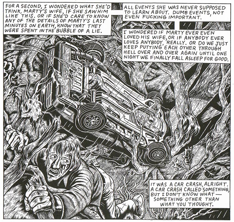 Lane's short comic stories have been published in comic books like 'Happy Hour in America', that also included his graphic novel 'Belligerent Piano'. Lane has self-published his experimental stories 'October Burlesque' and 'The Myth of Jack' as mini-comics. Fantagraphics has published a collection of his melancholic, nightmarish and self-reflective stories, called 'Abandoned Cars', in 2008, as well as the graphic novel 'The Lonesome Go' in 2014.