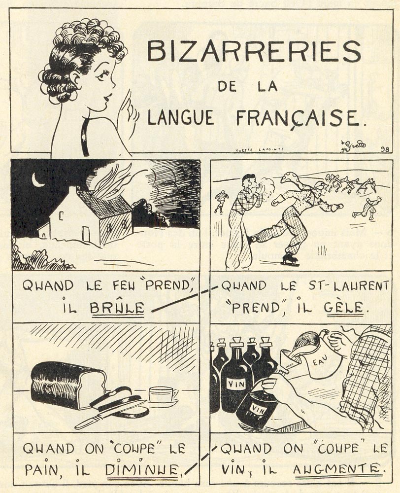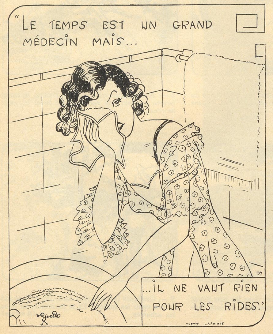 Yvette Lapointe was also active illustrating advertisements, for instance for Nugget shoes. In 1943, she got married and retired from her graphic career. She had four children. Yvette Lapointe passed away in 1994. Somewhat faded away in obscurity, she enjoyed a revival in 2017, when her work was exhibited during the 30th edition of the Festival de la BD Francophone de Québec. For the occasion, she was posthumously awarded the Prix Albert-Chartier. Her four sons, all active in the field of mathematics, were present during the ceremony.