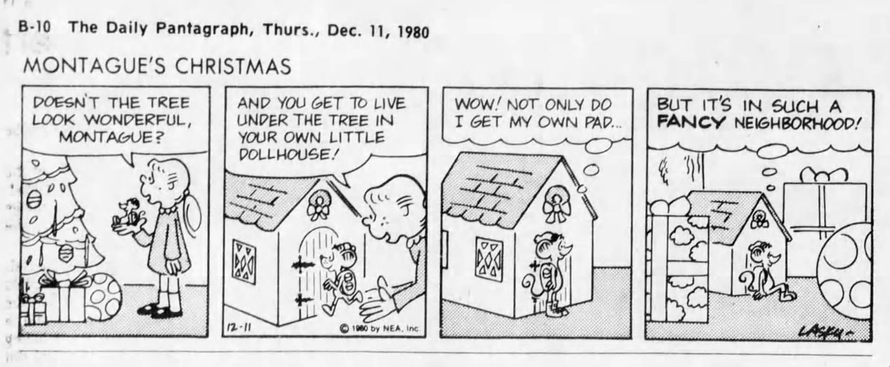 During his short life, Mark Lasky worked on only a few features of his own. In 1972, 'Seaside Society' started in the University of Bridgeport college newspaper. Between October 1974 and May 1975, it was syndicated twice a week in the daily strip format by the Milford Citizen syndicate. In 1980, the Newspaper Enterprise Association hired him to create the seasonal newspaper feature, subsequently 'Montague's Christmas' (December 1980) and 'Montague's Return' (December 1981), about a homeless mouse, who discovers the joys of the holiday season. Around the same time, Lasky had a single panel humor feature called 'Antennas'.