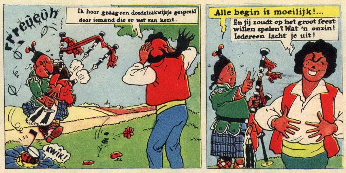 Largely inspired by the stories of Sir Walter Scott, during the late 1920s Laudy developed a keen interest in Scotland and especially the fabrication of bagpipes. He paid regular visits to the Edinburgh-based bagpipe manufacturer Andrew Ross. During his lifetime, he personally fabricated and restored over 200 instruments. It may not come as a surprise that Scotland was a regular setting for Laudy's comic stories. In 1984, plans were made to collect Laudy's many sketches and watercolor paintings of Edinburgh in a book called 'Les Rues d'Edimbourg', but this project was never finished. As an inside joke, the Flemish comic creator Willy Vandersteen later gave Jacques Laudy a cameo in his 'Suske en Wiske' album 'Het Spaanse Spook' (1948). His role was the bagpipe player whose instrument is shot away by cannon, but magically still keeps playing music.