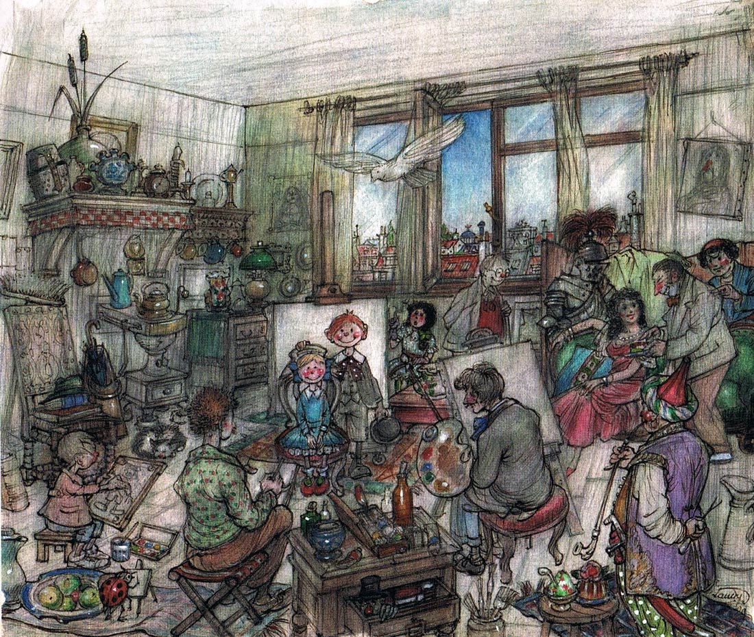 Painting from 'Le Royaume d'Edgar J' depicting several of Laudy's characters, as well as the painters Moitroux and Buisseret.