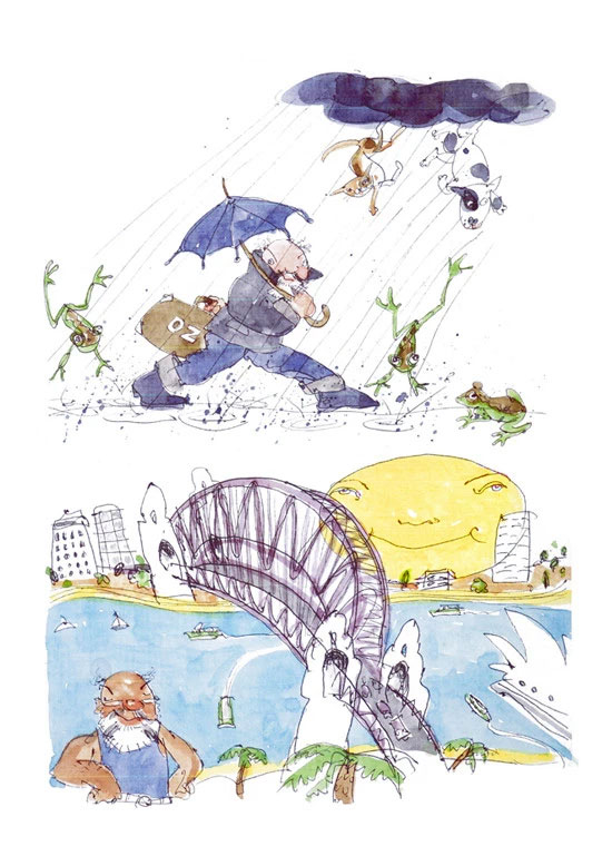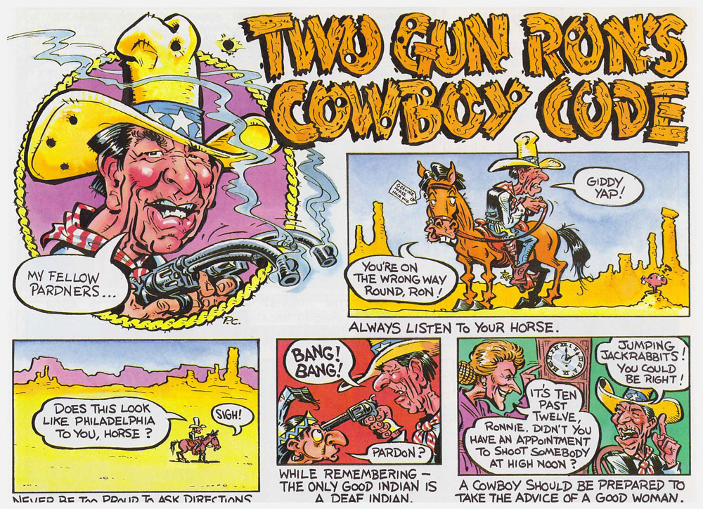 Comic art by Paul Cemmick (from 'Spitting Image: The Giant Komic Book', 1988).