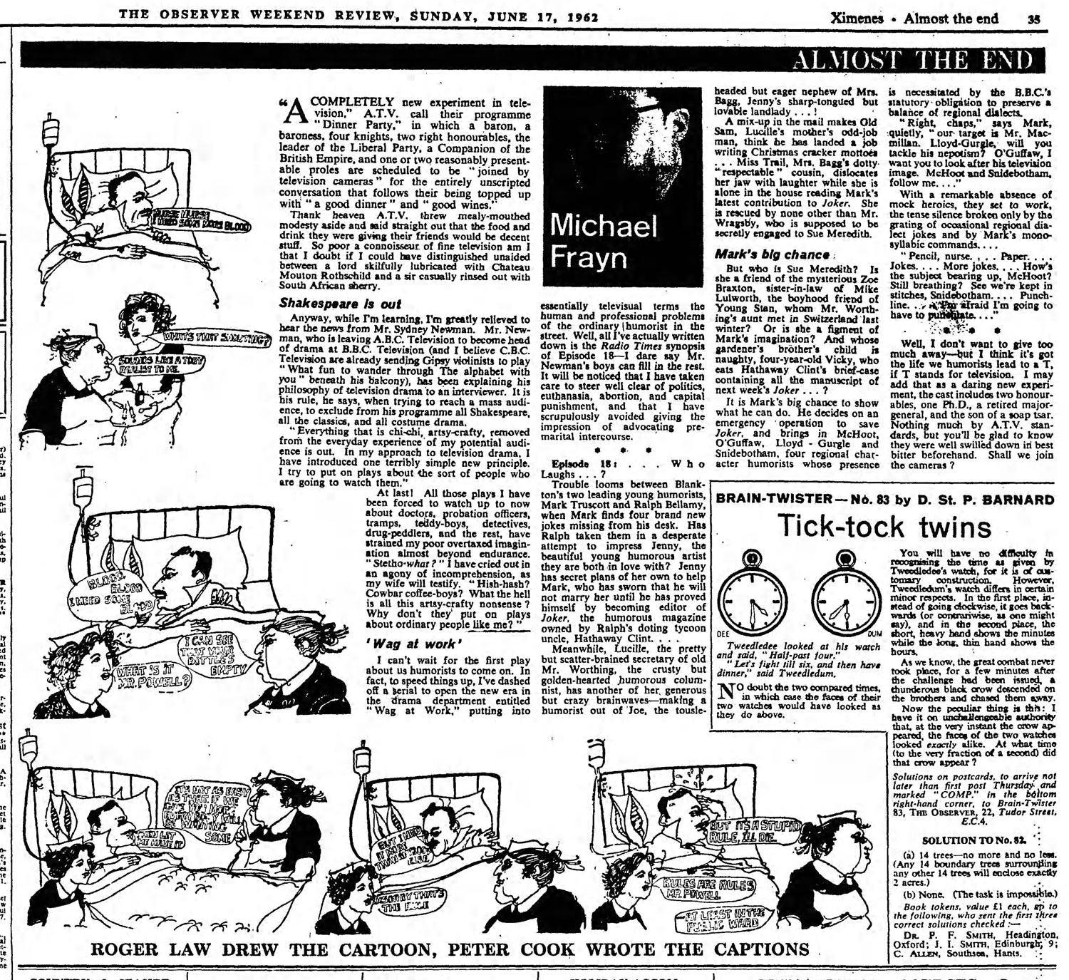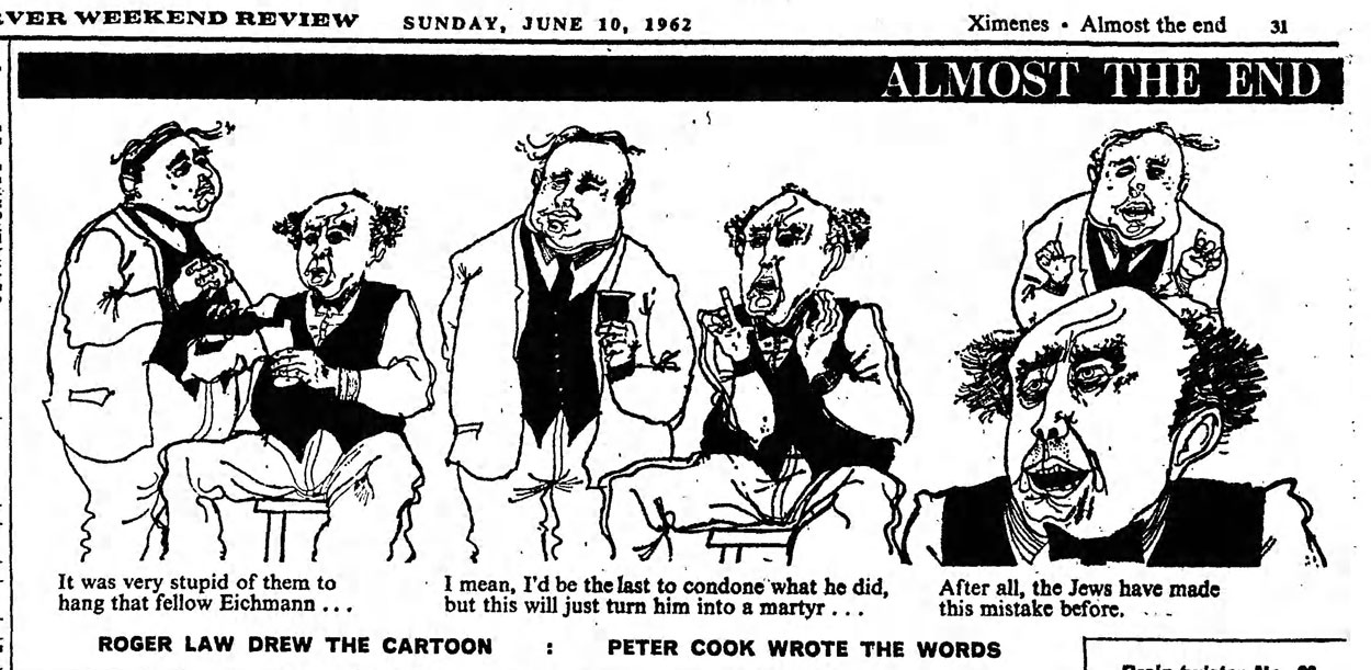 For the newspaper The Observer, Law drew a comic strip, 'Almost the End' (1962), scripted by Peter Cook and Michael Frayn. Many episodes were inspired by current events and quite risqué, like the gag in which two men discuss modern theater: "You know, I go to the theater to be entertained. I don't want to see plays about rape, sodomy and drug addiction. I can get all that at home." Cook's media career took up so much time that he usually sent in his scripts at the very last minute. After six weeks, 'Almost the End' came to an end. Editor David Astor objected to a gag in which a mental patient escapes from an institution, commits a robbery and is then declared sane as a result. After being sent to prison and flogged for his crimes, Home Secretary Rab Butler passes by and says: "The flogging is necessary, because he had offended so regularly he must be off his head." Astor didn't like this joke at the expense of Butler, because it also included the politician's wife. The editor even canceled the entire satirical page in The Observer altogether.