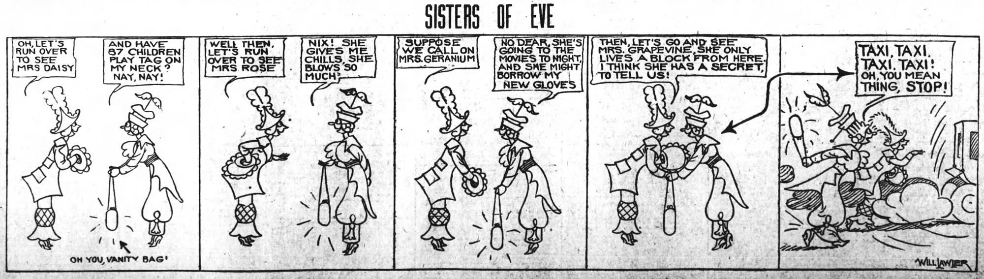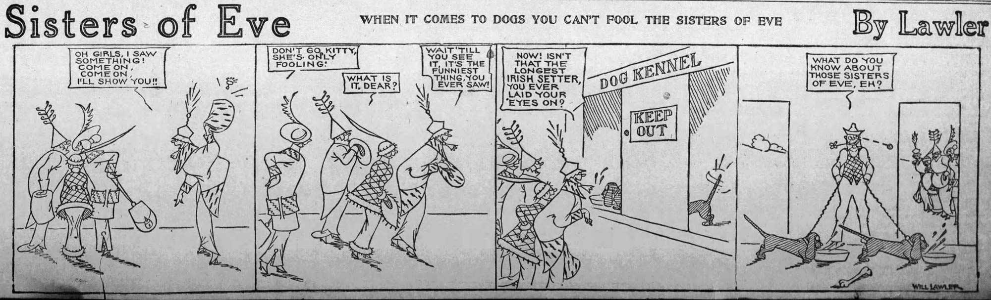 Not much is known about William Lawler's life. He was present in the New York Evening Telegram at least between 1912 and 1914. His longest running solo feature was 'Sisters of Eve', a gag strip about a group of ladies. Although their clothing hints at a certain amount of wealth and class, they certainly aren't too clever and mostly fill their days with gossiping. The strip ran from 6 December 1912 until 13 February 1914, and also appeared in a couple of local papers, such as The Anaconda Standard and The Houston Post. Lawler subsequently made the short-lived weekday strip 'Discord in 'A' Flat' from 22 February 1913 until 24 January 1914.