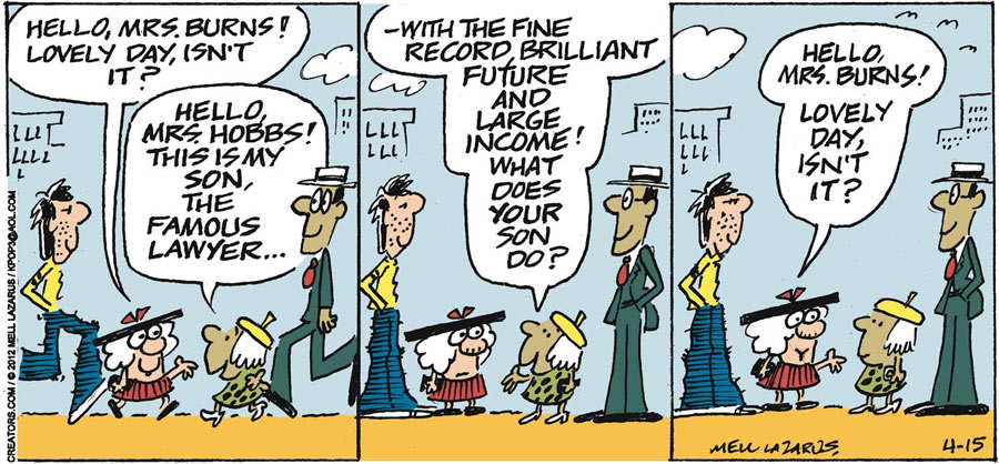 Mell Lazarus passed away at the age of 89 on the morning of 24 May 2016, at his home in Woodland Hills, California. He was an influence on Zoran Kovacevic. 'Momma' was parodied by Howard Cruse in the section 'Playboy Funnies' of Hugh Hefner's Playboy (January 1979).