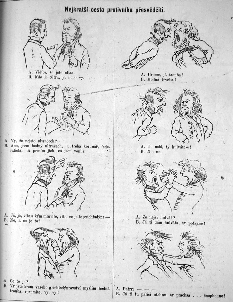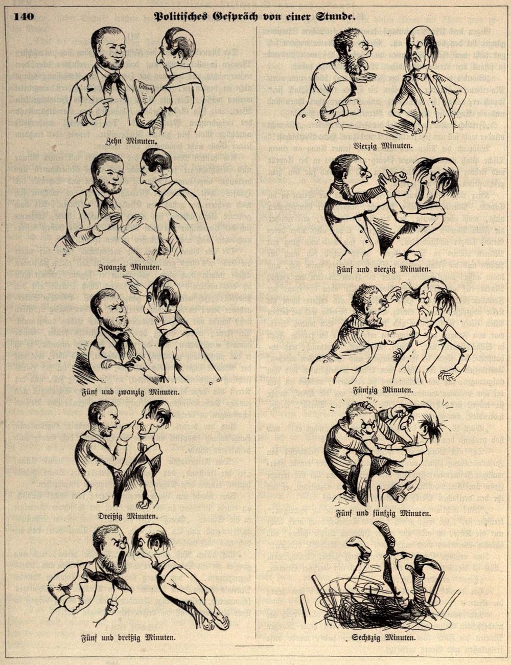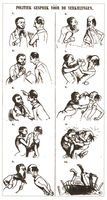Christiaan Le Blansch is credited with at least one cartoon in the second issue of 6 January 1849. The piece represents a "political discussion before the elections" in ten images. Two stately gentlemen begin their conversation in a civilized manner, but end up in a brawl. The origin of the cartoon is a mystery. The same strip appeared under the caption "political talk in one hour" in the 162th issue of the German satirical magazine Fliegende Blätter in the first half of 1848... about a year before Polichinel. Although it is possible that Le Blansch was a contributor to this publication, it is more likely that he traced the German original for the Dutch publication. It was known that the Polichinel editors regularly copied cartoons and drawings from German publications like Illustrierte Zeitung.