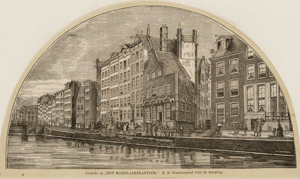 Wood engraving of the guildhall for brokers ("Het Makelaarskantoor") at the Amsterdam Nieuwezijds Voorburgwal (1860).