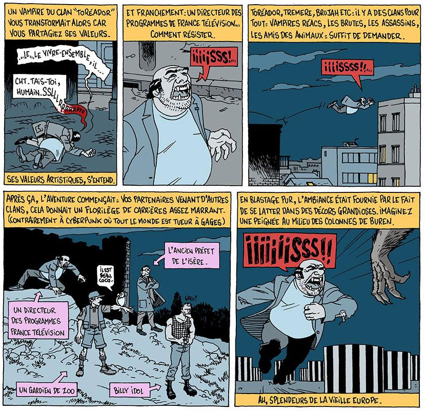 Monsieur le Chien is the creator of a blog of the same name. He has been crafting his own ribald and shimmering universe full of low populism and whore-hoppers since 2005. His activities found their way to paper in 2007, when Théloma started publishing collections of Monsieur de Chien's work. He has also worked for other publishing houses since then, such as Makaka ('Feréüs le Fléau' in 2009) and Carabas ('Didier Barcco', 2011-2013).