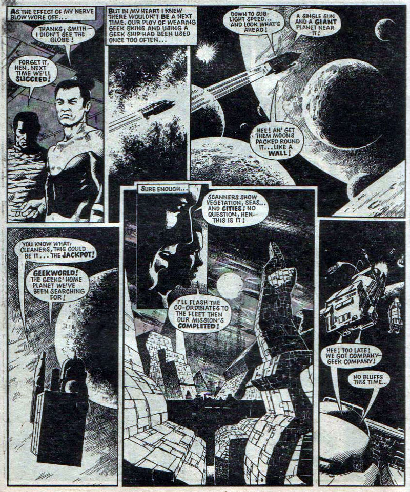 Born in 1954 in London, Garry Leach attended Central St. Martins College. During the second half of the 1970s, Leach's meticulous art style first came to notice in the fanzine Kidz Stuff, published by Hunter Tremayne and Andrew Johnson. In 1978, he was hired by the London publishing group IPC to work for the sci-fi comic anthology 2000 AD (at the time appearing as "2000 AD and Starlord" and then "2000 AD and Tornado"). One of his first jobs was inking Trevor Goring's 'Dan Dare' story 'The Doomsday Machine' (1978). He was later assigned to pencil science fiction features such as 'M.A.C.H. 1' (1977) - originally created by Pat Mills and Enio - and the magazine's flagship series 'Judge Dredd' (1977), created by John Wagner and Carlos Ezquerra. 'Judge Dredd' serials penciled by Leach were 'The Day The Law Died part 15' (1979), 'Night of the Blood Beast' (1979), 'Attack of the 50 ft. Woman' (1986), 'The Comeback' (1987) and 'Ten Years On' (1987). Together with Will Simpson and Dave Elliott he contributed to the longer 'Judge Dredd' narrative 'Oz', under the pseudonym K. Edward.