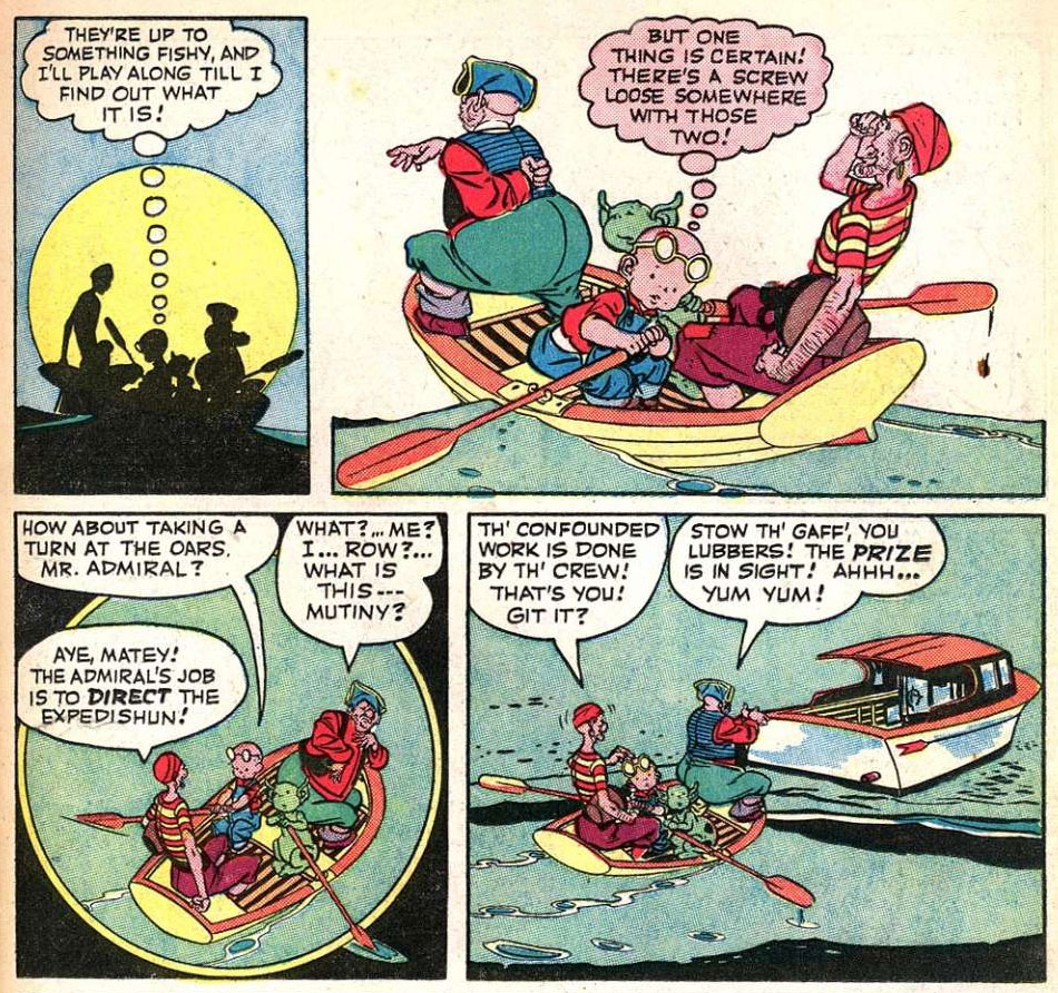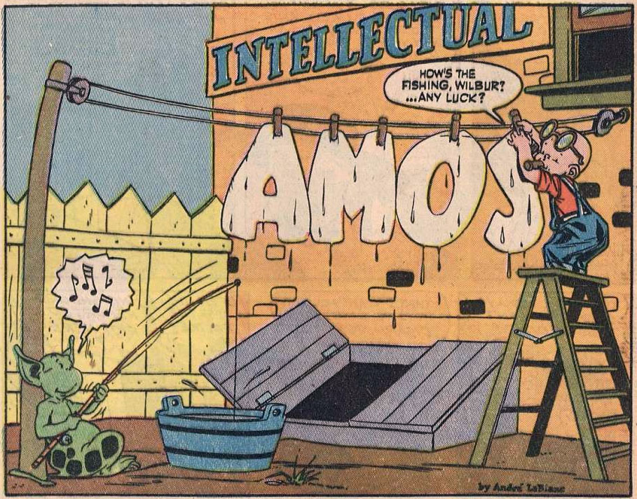 André LeBlanc continued to produce 'Intellectual Amos' when in 1944 he moved from Cuba to Brazil. There, he married his Brazilian wife Elvira Telles and settled in Niterói, a residential suburb of Rio de Janeiro. However, mailing his weekly comic pages to the USA eventually became problematic. The packages were intercepted by US customs and heavily taxed as works of art. Publisher Arnold was not prepared to pay the thousand dollar fine, and as a result the weekly 'Intellectual Amos' feature came to an accidental end on 29 April 1945. It was replaced by Al Stahl's 'Flatfood Burns'. Between February 1945 and August 1947, longer monthly stories with Amos and his sidekick Wilbur the Goblin appeared in Quality Comics titles like Police Comics and National Comics.