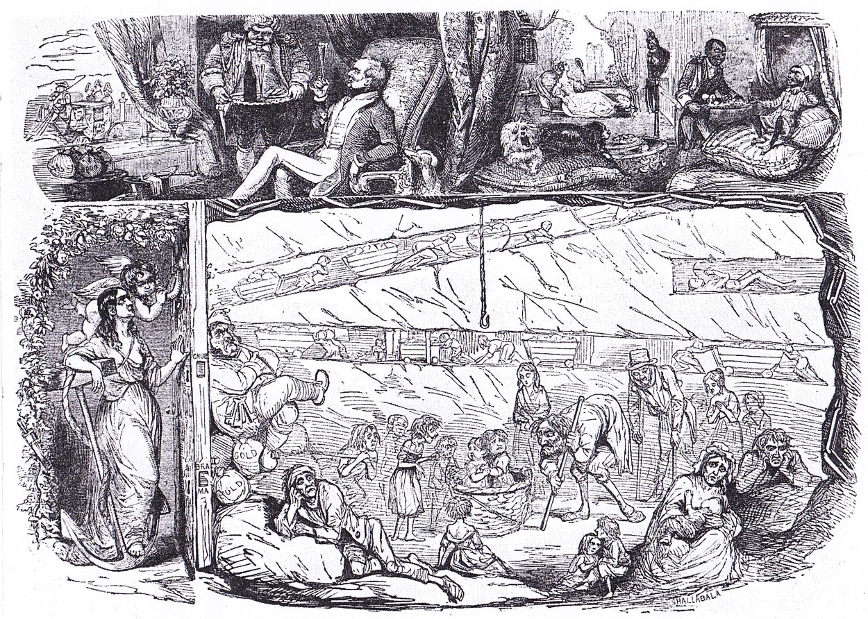 One of his best known cartoons is 'Substance and Shadow' (1843). It shows a group of poor people gazing at paintings in a lavish art gallery. The contrast between the triviality of "high art" and their far more serious problems remains powerful until this day. The same year Leech created another iconic socially conscious cartoon: 'Capital and Labour' (1843). The work criticizes the living conditions of the common people, inspired by a parliamentary report on child labor in the United Kingdom. In the cartoon three separate images are depicted within one drawing. On the top we see rich upper class people enjoying their luxury, while below them poor workers slave and starve away in a coal mine. The central figure is a hunchbacked man with crooked legs, barely able to keep in balance on his stick. 'Capital and Labour' has become one of the defining images of the Industrial Revolution. The cartoon has been reprinted in countless history books. The work is also interesting as a prototypical comic. The comparison between the rich and poor life can be interpreted as happening simultaneously, but the reader can also read the images as a continuation in time.