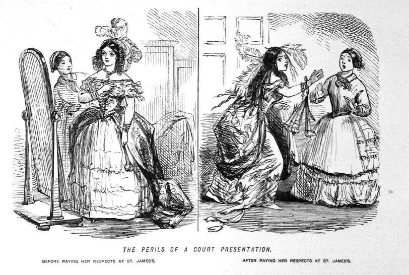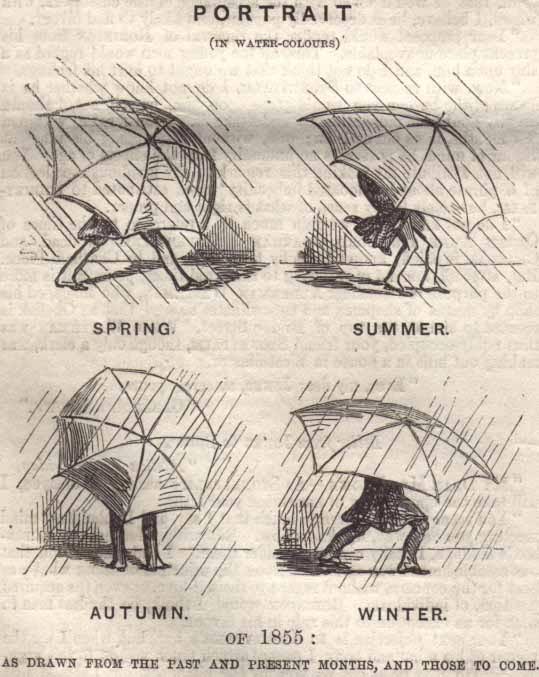 'The Perils of A Court Presentation' (1851) shows a woman preparing to go to a court presentation. This was an opportunity for young women to present themselves to bachelors. In the next panel we find out that the men presumably fought to get her first. An extra joke is that she went to St. James's, a street known for its many gentlemen's clubs. Women are ridiculed again in 'Ladies of Creation - Bloomerism No. II' (1851),where the sort of leg that would actually look good covered by the latest fashion is announced. In the next panel they turn out to be legs covered completely underneath bloomer dresses. Another two-panel cartoon, 'A Very Young Mariner/ A Mariner' (1852), shows the age and attitude difference between a young boy interested in mariner life and what he presumably becomes once he turns adult.  A similar cartoon is 'The Garret and the Conservatory' (1852), where Leech depicts the different lives led by a garret and a conservatory. Particularly interesting is 'Battle of the Pianos' (1855), which shows two families in opposite rooms trying to drown out their neighbors with loud piano music. The cartoon uses two panels as well as speech balloons. Also worth mentioning is the one-panel cartoon 'Hunting Memorandum' (1853) where a man fell from his horse. His pain and dizziness are visualized through a series of scribbles, stars, curly drawings and vague images, which predate similar symbols used in comic strips. A timeless cartoon, 'Weather, As Drawn From The Past and Present Months, And Those To Come' (1856), proves that even back in the day English weather was associated with constant rain. We see a man hiding underneath his umbrella during heaving rainfall in all four seasons. Leech uses four sequential images to tell this gag.