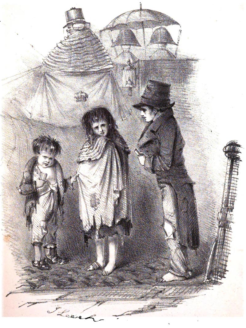 Leech was very concerned about the darker side of the Industrial Revolution. While the factory owners became rich off their properties, many of their employees worked long and exhaustive hours for a measly payment. Those without a job had to live like beggars or criminals to survive. Leech's cartoons caught the attention of another socially conscious celebrity: Charles Dickens. Leech had tried to get in touch with the popular novelist before, when Dickens looked for a new illustrator of his popular series 'The Pickwick Papers' after the original illustrator, Robert Seymour, had committed suicide. Back then Dickens had shown no interest. But now he asked Leech to illustrate his next story: 'A Christmas Carol' (1843). The tale of the greedy miser Ebenezer Scrooge and his change of heart on Christmas night was perfect material for the artist. It offered a strong message of helping the needy. Leech visualized the dark, foggy streets of London and the poverty of the disadvantaged. Much of the atmosphere, characters and moving series of events were deeply etched in the public consciousness through his garish-looking drawings. He created the definitive visual designs of Scrooge, his ghostly partner Jacob Marley, poor employee Bob Cratchit and his crippled son Tiny Tim, the jolly Fezziwig, the guilt-inducing children Ignorance and Want and the Ghosts of Christmas Past, Present and Future.