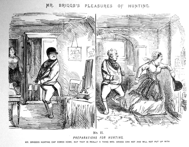 Leech's most significant contribution to comic history is his one-panel cartoon 'The Pleasures of Housekeeping' (1849), which introduced a comedic character named Mr. Briggs. From 1850 on this bumbling man appeared in a series of text comics which occasionally feature speech balloons. They are different from his other cartoons since they actually follow a storyline. In four episodes Briggs tries out hunting, shooting, racing and fishing, all with disastrous results. Briggs can be considered one of the earliest recurring comic characters, after Thomas Rowlandson's 'Mr. Syntax' (1820). The series appeared nearly two decades before Émilie de Tessier (Marie Duval) and Charles H. Ross created 'Ally Sloper' (1867). It even acquired some celebrity fans. John Everett Millais painted a portrait of a child reading the comic book 'Mr. Briggs' Sporting Tour'. This may very well be the first comic book to be part of a painting. Novelist Georges du Maurier also loved Mr. Briggs and praised it as "Leech's masterpiece" with the following words: "(…) the example above all others of the most humorous and good-natured satire that was ever penned or penciled."