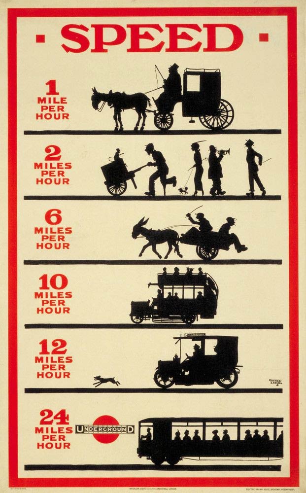In London, Leete gained fame as a commercial artist and created numerous advertisement posters for products like Guinness, Bovril, William Younger's Scotch Ale, Lever's shaving sticks, Rowntrees chocolates and the London Underground metro system. In 1915, Leete made a sequential advertisement to promote the London underground system. It featured six moments in the history of transport, visualized in silhouette form, complete with the speed per hour it took back then. The final image shows the underground trolley as the fastest way to travel.