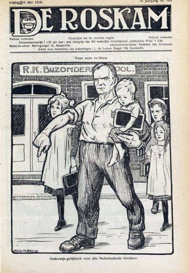 Louis de Leeuw provided the weekly political cartoon on De Roskam's front page, but his art also appeared on many of the magazine's interior pages. Some of his contributions had sequential narratives, revealing influences from the picture stories made by Felix Hess for De Groene Amsterdammer, as well as the fervor of De Notenkraker's Albert Hahn. Starting in 1924, some of Louis de Leeuw's cartoons were reprinted in the anti-revolutionary magazine De Houten Pomp. Other prominent artists for De Roskam were P.A. Schols, Frans Lazarus and Joan Collette.