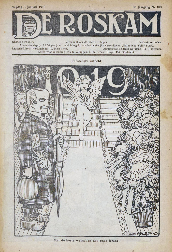Besides fine art activities like making landscapes and figurative studies, Louis De Leeuw was best known as the lead cartoonist of De Roskam. Published between 1912 and 1939 as a supplement to the weekly Het Katholieke Volk and then newspaper De Volkskrant, De Roskam was a political satirical weekly belonging to the Catholic segment of Dutch society. Its main competitor was the left-wing magazine De Notenkraker, and much of De Roskam's satire was aimed at the socialist movement. One of the main targets was the social-democratic foreman Pieter Jelles Troelstra, who held an infamous speech in the House of Representatives on 12 November 1918, stating it was time for the Dutch working class to seize power. However, most of the Dutch citizens weren't in favor for a political coup, making his plans an utter failure.