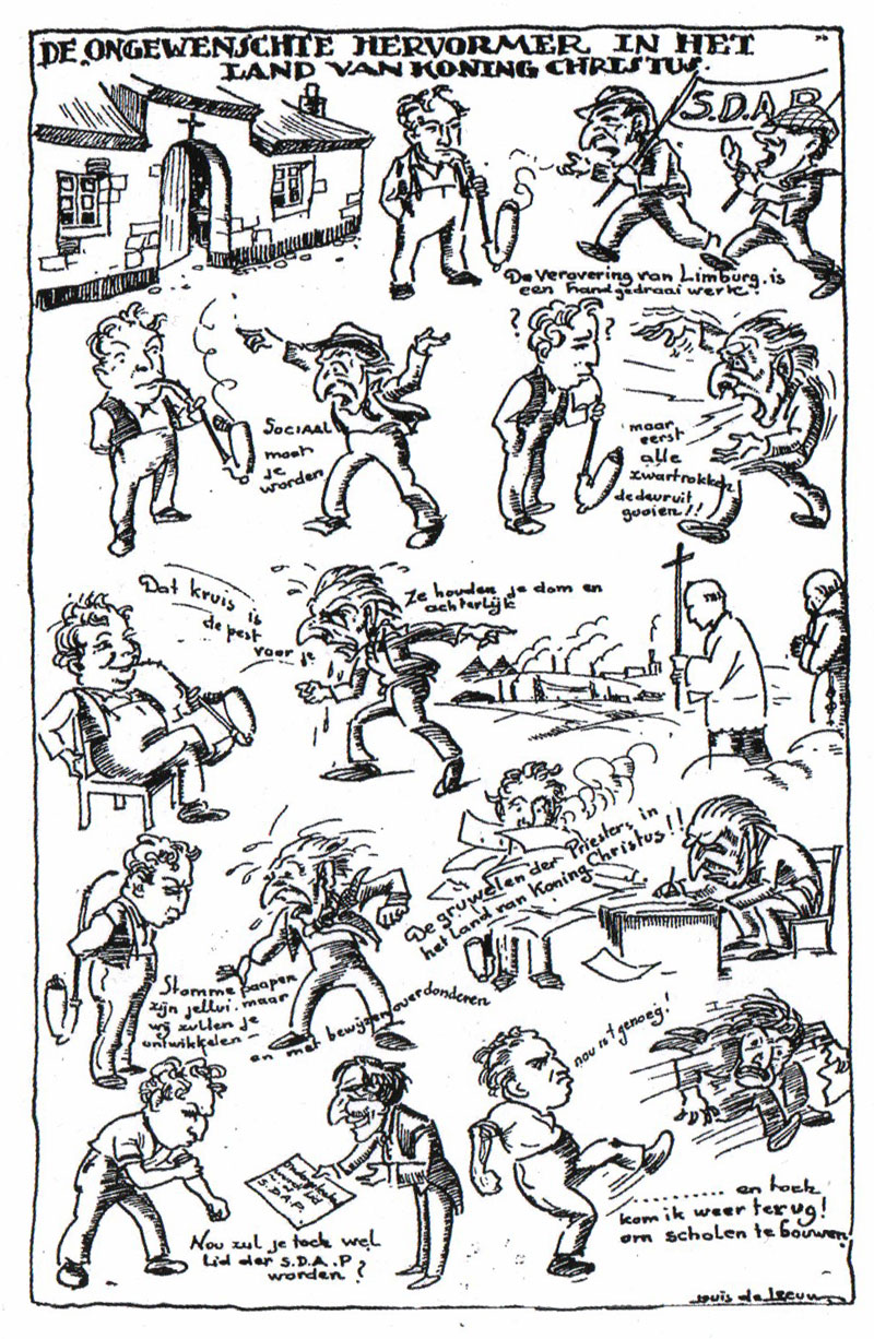 Picture story by Louis de Leeuw for De Roskam, reprinted in De Houten Pomp of 8 May 1929. The devoted Catholics in Limburg are not interested in the socialist propaganda of the SDAP party, and the representative is kicked out of the province.