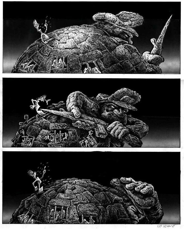Jean-Louis Lejeune was born in 1946 in Andenne in the province of Namur. After reading Calvo's 'La Bête Est Morte', he knew he wanted to become a cartoonist. Between 1964 and 1967, he attended high school at Saint-Luc in Brussels, and subsequently had his secondary education at this Art Institute, graduating in Graphic Communication in 1970. Among his favorite painters and illustrators are Boris Arbtzybasheff, Pierre Bernard, Honoré Daumier, Gustave Doré, Shigeo Fukuda, Edward Gorey, J.J. Grandville, Heinrich Kley, Alfred Kubin, David Merveille, Ever Meulen, Benjamin Rabier, Mario Ramos, Félicien Rops, Teresa Sdralevich, Ronald Searle, Joost Swarte, Tomi Ungerer and Gabrielle Vincent. In the field of animation, Lejeune admires Tex Avery, Ub Iwerks and Picha. His favorite comic artists and cartoonists are Blutch, Gus Bofa, Jean Bosc, Claire Bretécher, Wilhelm Busch, Chaval, Robert Crumb, Jack Davis, Jean Effel, André François, André Franquin, Gébé, Rick Griffin, Louis Joos, Francis Masse, Victor Moscoso, Reiser, Sempé, Art Spiegelman, Saul Steinberg, Roland Topor, Willem, Winshluss and Basil Wolverton.