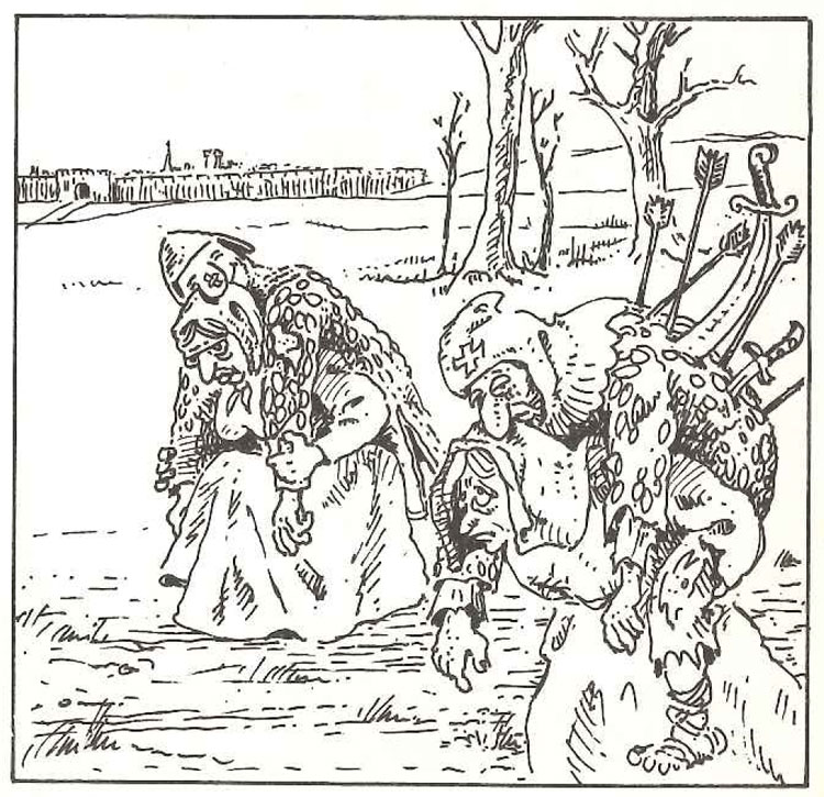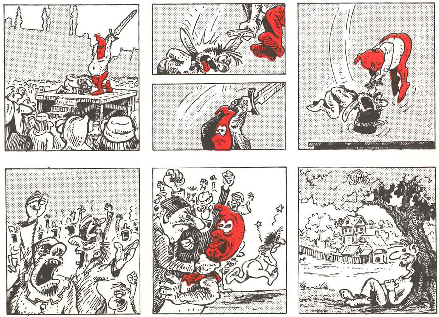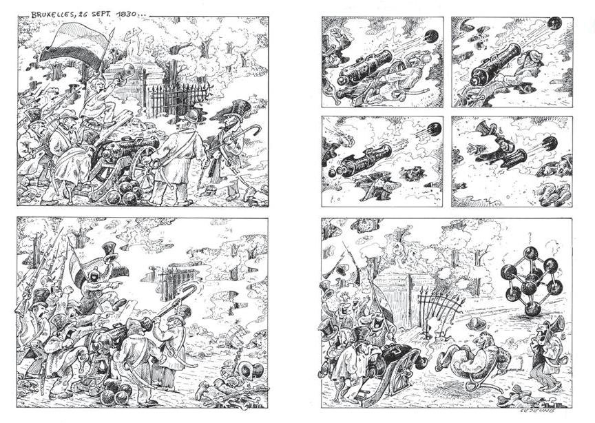 Crossing the line between illustration and comics, Lejeune livened up the pages of the 1979 book 'Bruxelles Babel: Chronique Illustré de Bruxelles', written by Michel Géoris (French edition) and Walter Soethoudt (Dutch translation: 'Brussel, De Sjanzende Stad: Brusselse Cronijcken'). The work was published at the occasion of the 1000th anniversary of Brussels in 1979. It provides a chronological history of the city, focusing on key events, remarkable historical characters and colorful anecdotes. The text is accompanied by Lejeune's witty illustrations, caricatures, one-panel cartoons and occasional gag comics. Speech balloons are used sparingly, often focusing on only one word or a short sentence. The majority of Lejeune's comics in the book are told in pantomime.