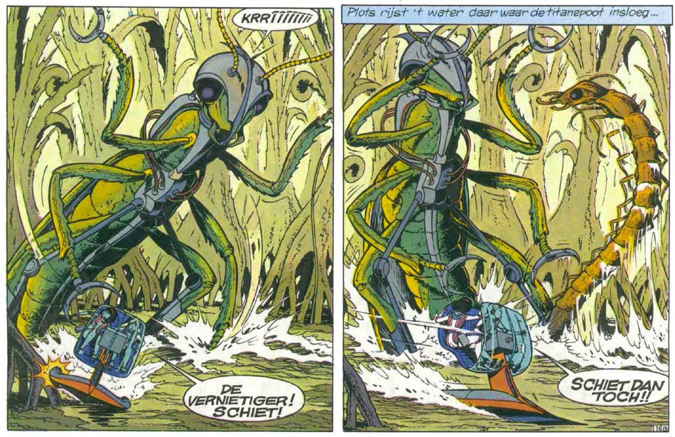 Roger Leloup takes great care in crafting believable technology-driven alien worlds and robotic creatures, and is known for using meticulous documentation. He personally visited many of the locations where Yoko's adventures take place to absorb the ambiance and take tons of photographs. This can be seen in the almost photorealistic depictions of Bali ('Le Matin du Monde', 1988), Hong Kong ('Le Dragon de Hong Kong', 1986), Cologne ('L'Or du Rhin', 1993) and Bruges ('L'Astrologue de Bruges', 1994), among other places. The author, however, permits himself some artistic freedom. Fans were confused why they couldn't find the graveyard near the German town Rothenburg ob der Tauber from 'La Frontière de la Vie' (1977)? It didn't exist, as Leloup used a Brussels site as inspiration. The mayor of the German town Sankt Goar once told Leloup that tourists asked him where they could find the Devil's Organ from 'L'Orgue du Diable' (1972)? Leloup also invests a lot of time in Yoko's personality. He talks about her as if she were from flesh and blood, and in the aforementioned Stripschrift interview Leloup stated that Yoko gives him purpose. Such an emotional connection between an author and his creation is unique in the comic industry, and is in Spirou perhaps only equalled by Alain Dodier and his PI 'Jérôme K. Jérôme Bloche'.