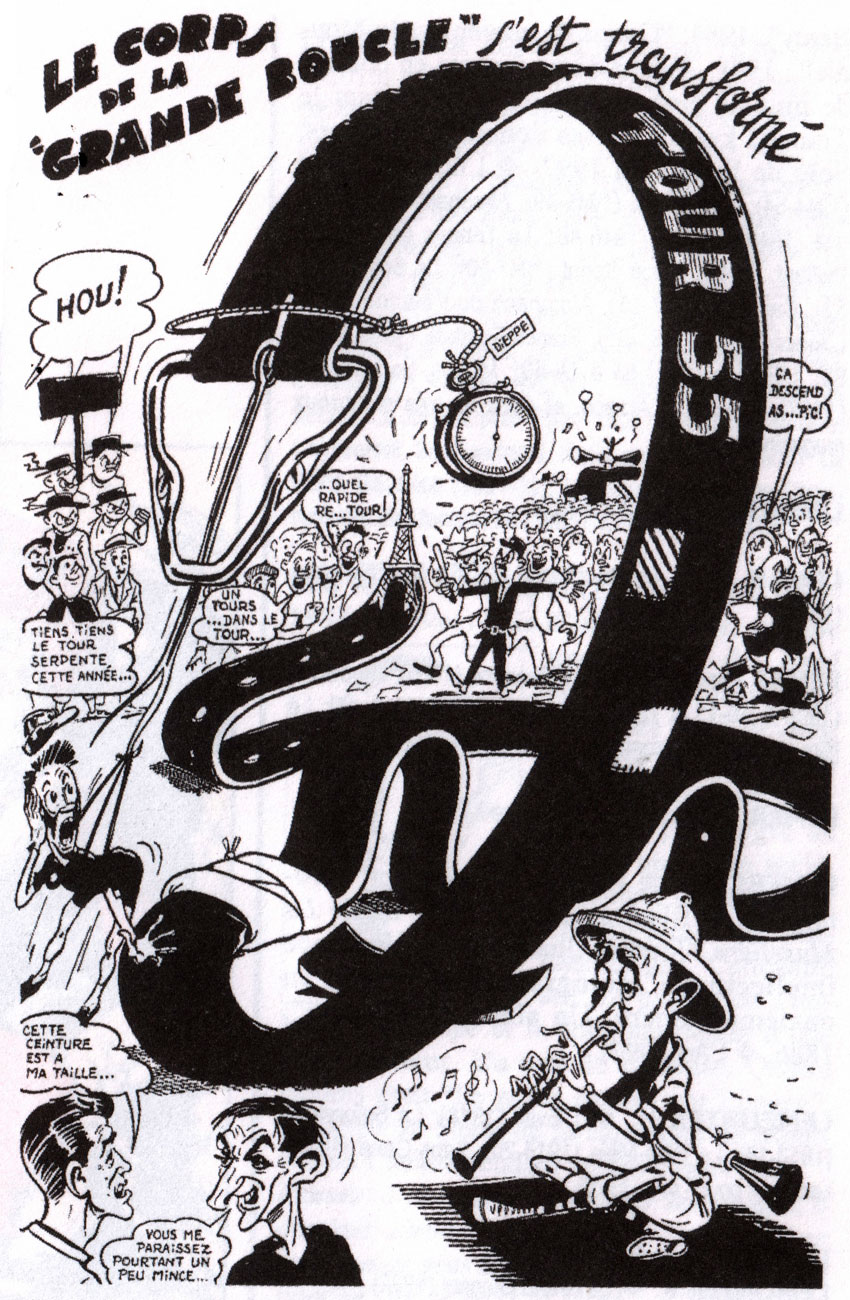 1955 cartoon by Jacques Lem starring caricatures of the cyclists Louison Bobet, Fausto Coppi and Tour de France organizer Jacques Goddet.