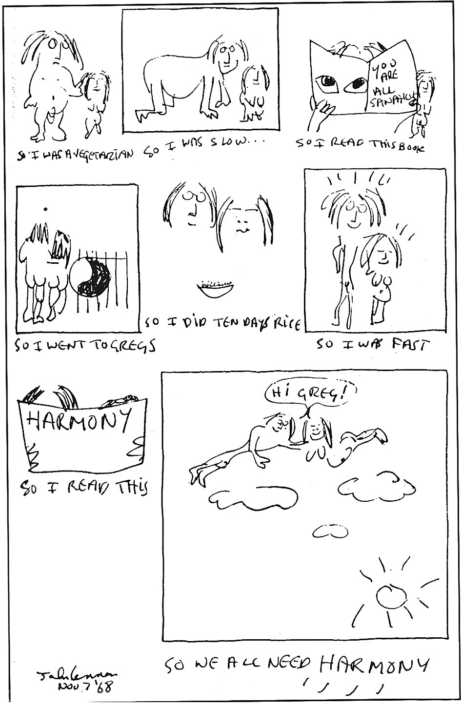 Around the time 'Two Virgins' was released, Yoko was hospitalized for her pregnancy. Lennon stayed at her side, making drawings to pass the time. One of them was the comic strip 'A Short Essay on Macrobiotics', drawn on 7 November 1968 for Gregory and Craig Sams, owners of the London macrobiotic restaurant Seed (AKA the Macro) and publishers of the health magazine Harmony. Growing more into a pacifist hippie, Lennon changed his eating habits and became a vegetarian. The comic chronicles how he started eating according to a macrobiotic diet, being partially an advertisement for the magazine. He portrays himself and Yoko in the nude, as they appear on the cover of 'Two Virgins'. Drawn with a potbelly, Lennon describes himself as "already a vegetarian" but "slow". After reading the Sams' macrobiotic book 'You Are All Sanpaku', he decides to visit his restaurant, eating rice "for 10 days" and becoming slim and healthy "fast" as a result. In the final panels, Lennon depicts himself having become an enthusiastic reader of Harmony, making the pun: "So we all need Harmony", while he and Yoko sit on a cloud of happiness, greeting Sams. Lennon and Ono often visited Seed and ordered food that Sams delivered to them, even while in the hospital. When Yoko needed compatible blood donors, Sams drove around London to find people willing to give her a transfusion. Unfortunately, she eventually had a miscarriage.