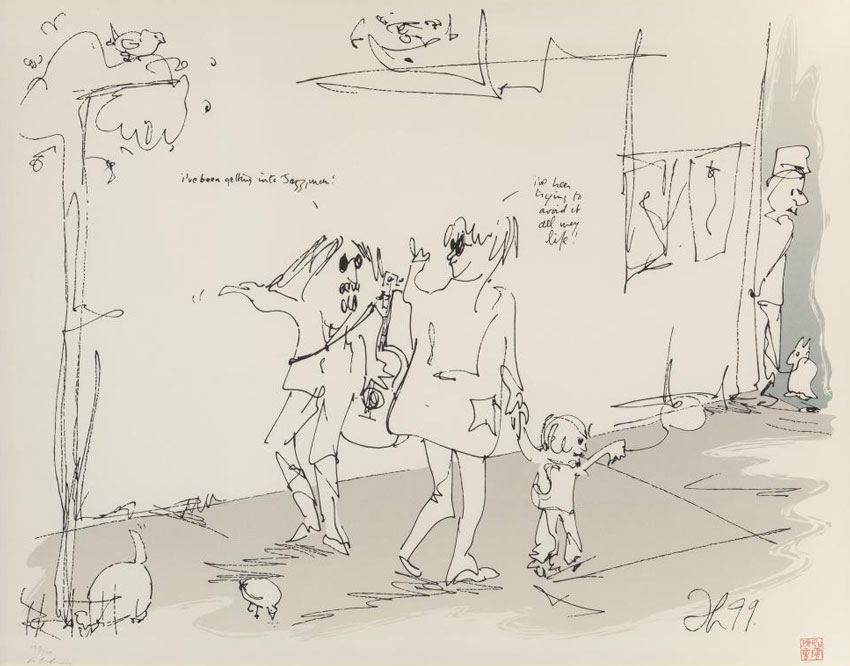 Around the time of the Beatles' global breakthrough, Lennon released the book 'In His Own Write' (1964). The work collects surreal poems, short stories and cartoons. Some hailed back to his high school days or were scribbled in between gigs. Others were directly created for the book's release. Inspired by James Thurber and the Lewis Carroll books 'Alice in Wonderland' and 'Alice Through the Looking Glass', everything is written in a whimsical style, filled with word play. Several words are deliberately misspelled to create double-layered puns. The minimalistic drawings are very reminiscent of Thurber's self-illustrated writings. Paul McCartney penned the foreword to 'In His Own Write', and co-wrote two pieces, 'On Safairy with Whide Hunter' and an unidentified piece. In 'On Safairy with Whide Hunter', Lennon uses a character named 'Jumble Jim', a pun on Alex Raymond's jungle comic 'Jungle Jim'. Another line, from his poem 'All Abord Speeching', reads "practice daily but not if you are Mutt and Jeff", a nod to Bud Fisher's newspaper comic 'Mutt & Jeff'.