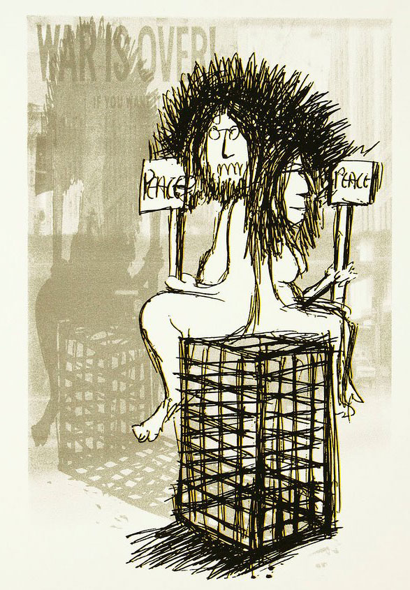 Lennon's next two solo albums, 'Life With the Lions' (1969) and 'Wedding Album' (1969) were again mixtures between avantgarde music and fly-on-the-wall recordings, with Yoko being audibly present. Either as a wailing singer, or song topic. Side 2 of 'The Wedding Album' consists of recordings made during their Bed-In in Amsterdam, ranging from press interviews to casual conversations. The sleeve featured photographs, press articles and newspaper cartoons about their well-publicized marriage and peace campaigns. Among them cut-outs from British newspaper cartoonists like Emmwood (who actually sent Lennon a signed copy of his cartoon), Stanley Franklin, Carl Giles, Gren, Keith Waite and Richard Wilson, but also Dutch newspaper cartoonists like Fritz Behrendt, Nico Rolle and Peter van Straaten. It also features a three-page balloon comic by Lennon, chronicling his marriage, honeymoon, airplane travels, hotel visits, bed-ins and bag-ins. Yoko and he are portrayed as two people inside bags, with their heads sticking out. The story ends with the couple dissolving into question marks, uncertain what the future will bring.