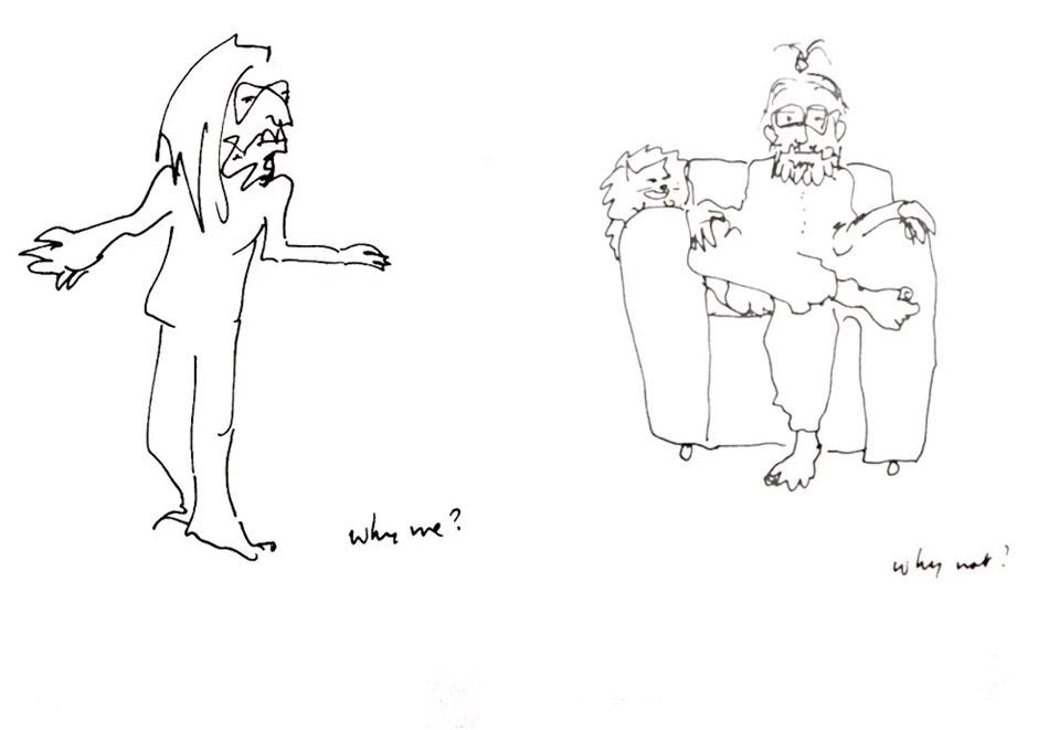 'Why me? Why not?'. Cartoon by John Lennon, featuring himself.