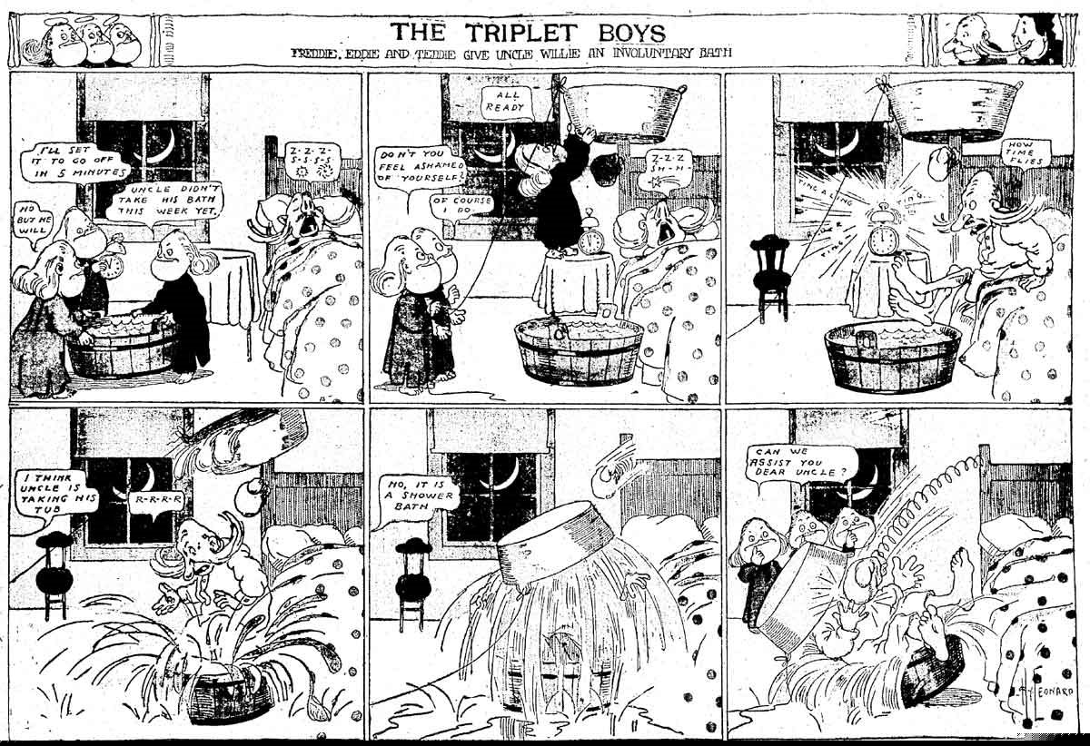 Almost nothing is known about Hy Leonard (referred to as H.T. Leonard in Allan Holtz's 'American Newspaper Comics' guidebook). In the early 1900s, he was a newspaper cartoonist for The New York Herald and The Philadelphia Press. Between 1 January and 2 April 1905, he drew the Sunday gag comic 'The Triplet Boys', about a mischievous bunch of triplets, named Freddie, Eddie and Teddie. The feature was obviously inspired by the success of Rudolph Dirks' 'The Katzenjammer Kids', only with three little tricksters instead of one. Just like Hans and Fritz from the Dirks comic, Leonard's Freddie, Eddie and Teddie also have a corpulent mother with a bun haircut, whom they call "Mamma".
