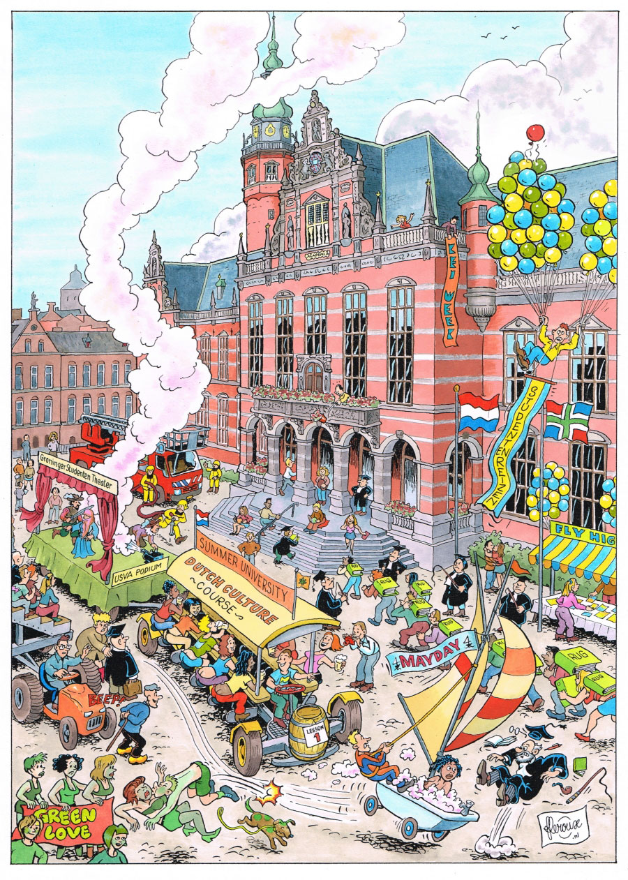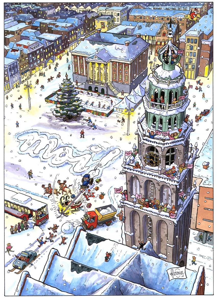 The city of Groningen forms an important part of Le Roux' oeuvre. Since the mid-1980s Le Roux has been famous for his large-format cartoons of the city, in which funny things happen in certain streets or specific hotspots. The first set was made for a calendar, which Le Roux made in cooperation with a local printer. The local Tourist Office was enthusiastic and ordered 6000 copies, which became a popular gift during the 1986 holiday season. Since then, Le Roux' drawings have appeared on billboards, postcards and in the local newspaper Groninger Dagblad as well. A collection of these drawings, accompanied by city sonnets by Driek van Wissen, appeared in the books 'Stad... twee maal twintig tijdsbeelden' (Profiel, 1999) and 'Stad...' (Profiel, 2000). Le Roux has additionally visualized many projects of the local government, including major renovations of the city center and the local eyecatcher, the Martinitoren (St. Martin's Tower), in the 1990s. Le Roux generally uses what he calls a "roof-gutter perspective", through which he can show all events from above. On some occasions he took it higher up. In April 1996 he spent several hours in the highest crane of the Netherlands (127 meters) to make a drawing of the Grote Markt. He was accompanied and assisted for this ambitious enterprise by his colleagues Jesse van Muylwijck and Jan Kruis.