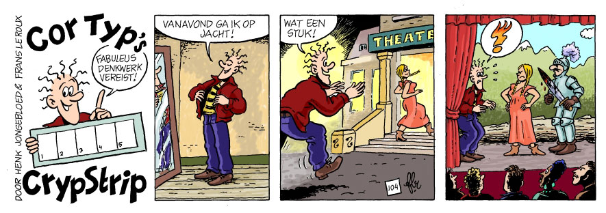 By the late 1970s Le Roux presented one of his projects to the comic magazine Eppo. He spent 2,5 years developing 'Bril en het Olie Monopolie', a story inspired by the oil crisis. However, by the time it was finished, Eppo didn't dare to launch new series because of the declining comic book market. The story remained shelved until it was recolored by Carola van Veen and self-published by the author in book format in December 2020. In the late 1980s, and early 1990s he made about 200 episodes of the puzzle strip 'Cor Typ's Crypstrip' for the VPRO Gids with writer and puzzle maker Henk Jongebloed. Each episode contained a hidden crossword. Le Roux self-published a compilation booklet, which is for sale on his website. Another comic character created by Le Roux is the dog 'Snuffel'. His gags appeared in the free environmental newspaper Plons Radio, which was distributed to primary schools in the Groningen region between 1993 and 1996. A comics/activity book starring the character was published by Quintus in 1998. His comic strip 'Max Millinx Memories' appeared in the late 1990s in the Millinx Money Magazine, a local newspaper for the Millinx neighborhood in Rotterdam Charlois. Among Le Roux' many commercial comics were a juridical info comic/cartoon for VARA TV Magazine, and the comic strip 'Soetie' for Max Havelaar coffee.