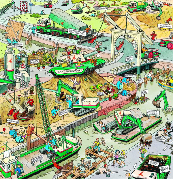 Among Le Roux' clients are educational publishers, youth magazines, trade journals, TV guides and regional newspapers, as well as cultural institutions, non-profit organizations and the (local) government. He has furthermore made animated shorts for TV stations. Le Roux' commercial artwork is generally for communicative or educational purposes, but often maintains a touch of humor. His complex but clear overview drawings in particular have been requested by many institutions and government agencies.